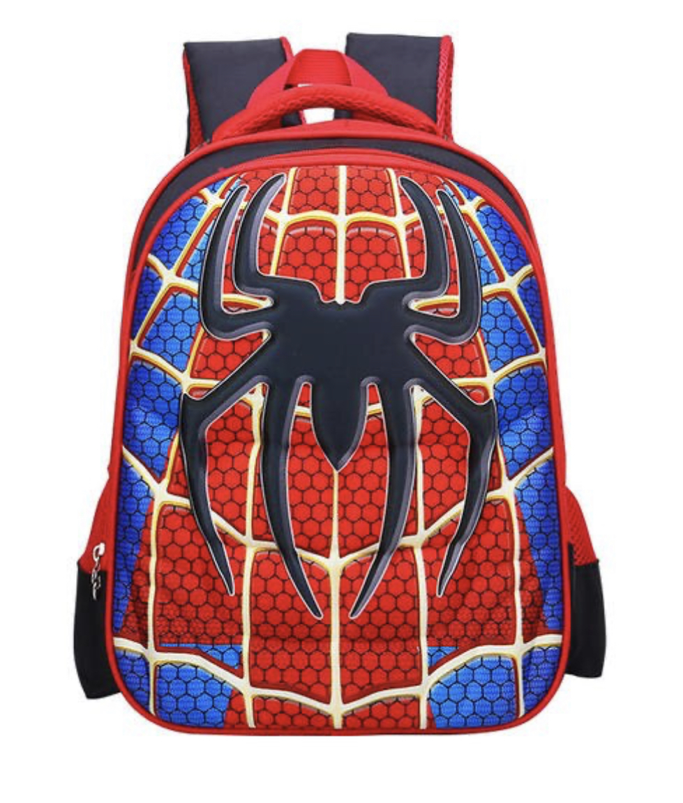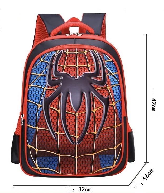 Дизайн: Рюкзак выполнен в красно-синей цветовой гамме с узором паутины и большим черным эмблемой паука на передней части. Лямки и боковые части рюкзака красные, что придает ему яркий и привлекательный вид.