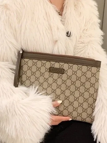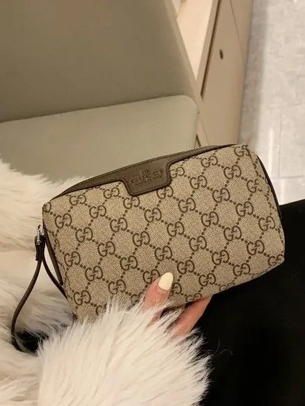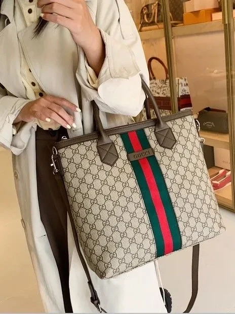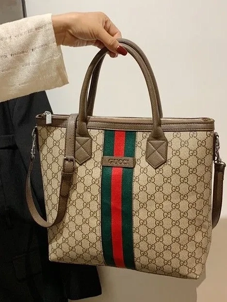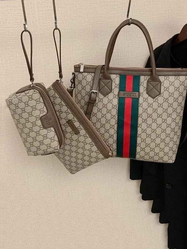 Элегантный комплект сумок Gucci – стильное и практичное решение для современных женщин. Основная сумка выполнена из фирменного материала с монограммой Gucci и дополнена культовой красно-зеленой полосой, что подчеркивает её премиальный статус.