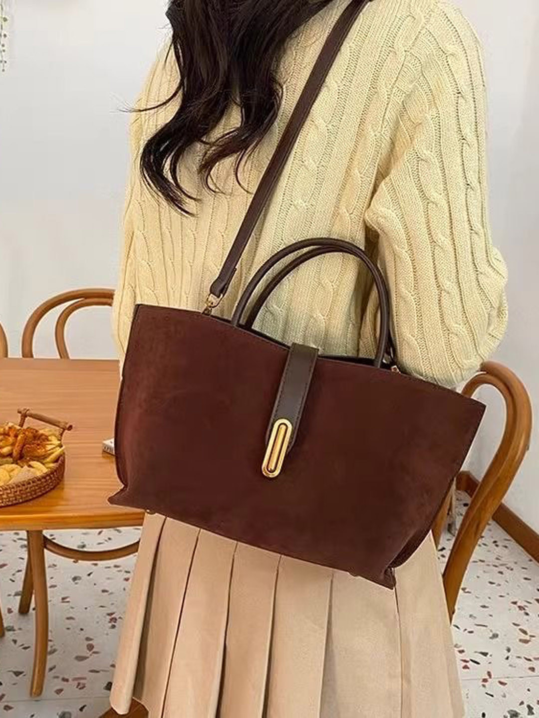Элегантная женская сумка в лаконичном дизайне, выполненная из мягкой искусственной замши. Оснащена двумя ручками и съёмным регулируемым плечевым ремнём для удобной носки. Украшена стильной застёжкой с металлическим акцентом. Подходит как для повседневных образов, так и для выхода.