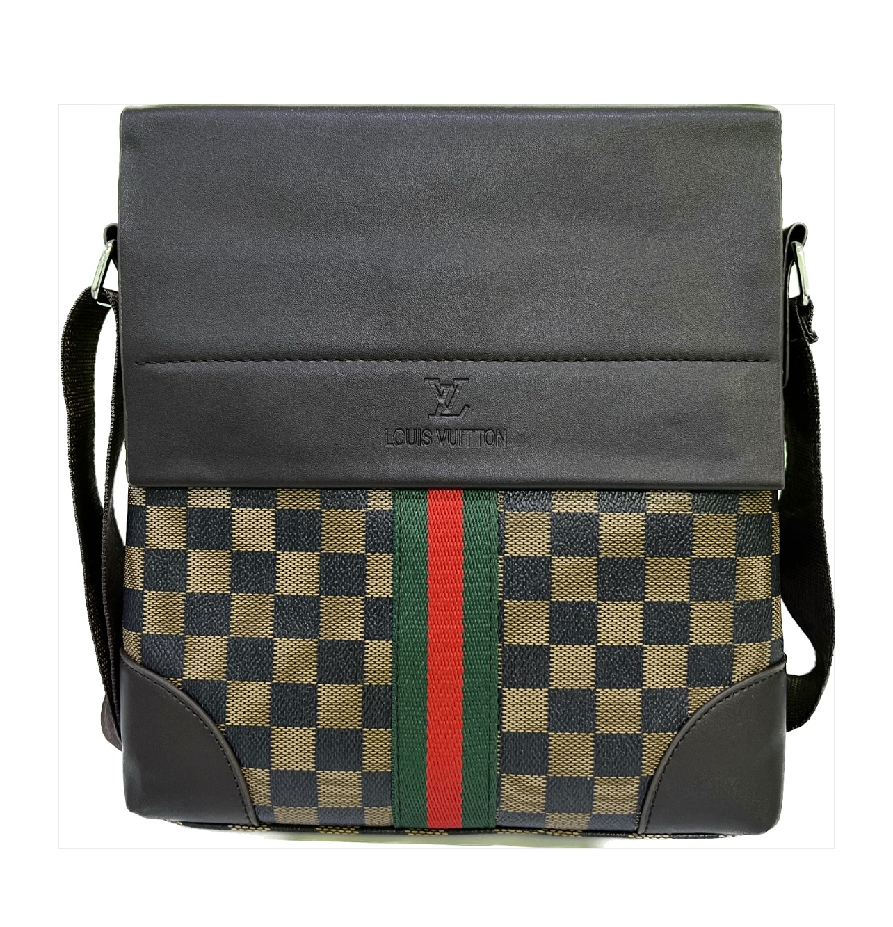 Дизайн: Клетчатый узор в коричневых и бежевых тонах с вертикальной зелено-красной полосой по центру. Верхняя часть сумки черная с тисненым логотипом "Louis Vuitton".