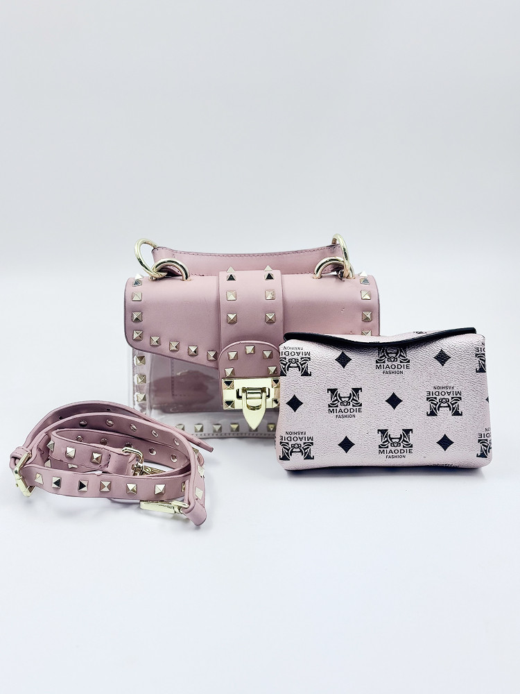 Эффектная и стильная сумочка для девочек, выполненная в модном дизайне с заклёпками и металлической фурнитурой. Основная часть изготовлена из прозрачного пластика с плотной декоративной вставкой под кожу и съёмным текстильным клатчем внутри. Клатч закрывается на молнию и украшен оригинальным принтом “MIAODIE FASHION”.