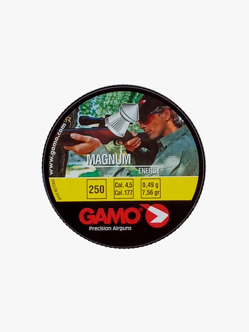 Gamo Magnum – штампованные, остроголовые шарики калибра 4.5 мм предназначены для пневматического оружия. Пули сделаны из свинца. Упакованные в жестяную коробку, количество – 250 шт. Свинцовые шарики предназначены в основном для применения в оружии с резьбовым стволом, ведь прохождение нарезами сообщает им дополнительные аэродинамические свойства, обусловливающие точность попадания патрона цель и удлиненную траекторию его полета. Форма головки у шариков магнума острая, коническая (pointed). Вопреки расхожему мнению, это никак не сказывается на увеличении проникающей способности патрона: этот показатель ничем не уступает пулькам со сферической формой головки. Преимуществом конуса является повышенная кучность и точность при стрельбе по сравнению с патронами вторых типов. Однако здесь важно обратить внимание на то, что форма конуса пулек должна быть исключительно правильной, поскольку любые отклонения приводят к искривлению центра тяжести и фактическому отсутствию точности как таковой соответственно.