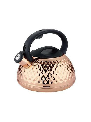 Стильный и практичный чайник со свистком станет изысканным дополнением вашей кухни. Корпус выполнен из прочной нержавеющей стали с золотистым покрытием и рифлёной текстурой, придающей ему элегантный и современный вид. Удобная термостойкая ручка с мягким покрытием обеспечивает безопасный и комфортный хват, а автоматический свисток сигнализирует о закипании воды.