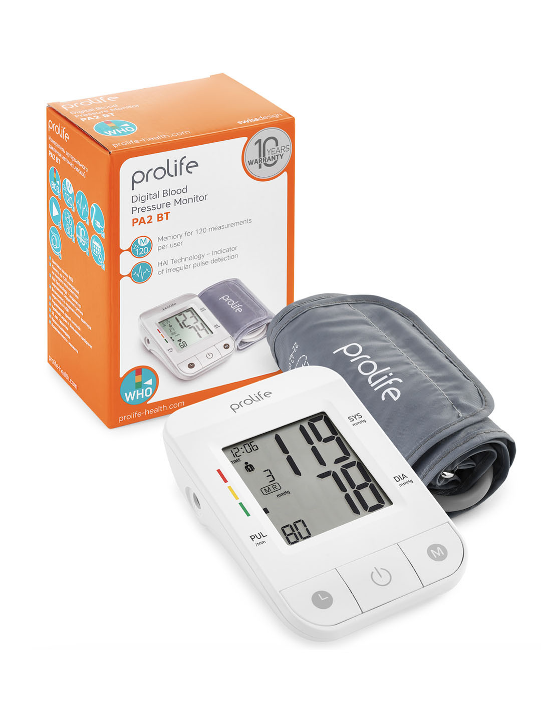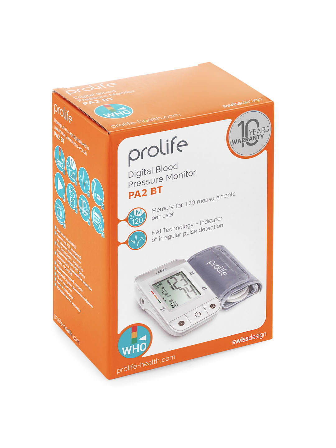 Prolife PA2 BT – автоматический тонометр для измерения давления и пульса на плече. Прибор оснащен индикатором нарушения сердечного ритма: если в процессе измерения у пользователя произошло нарушение сердечного ритма – на экране тонометра появляется соответствующий символ.