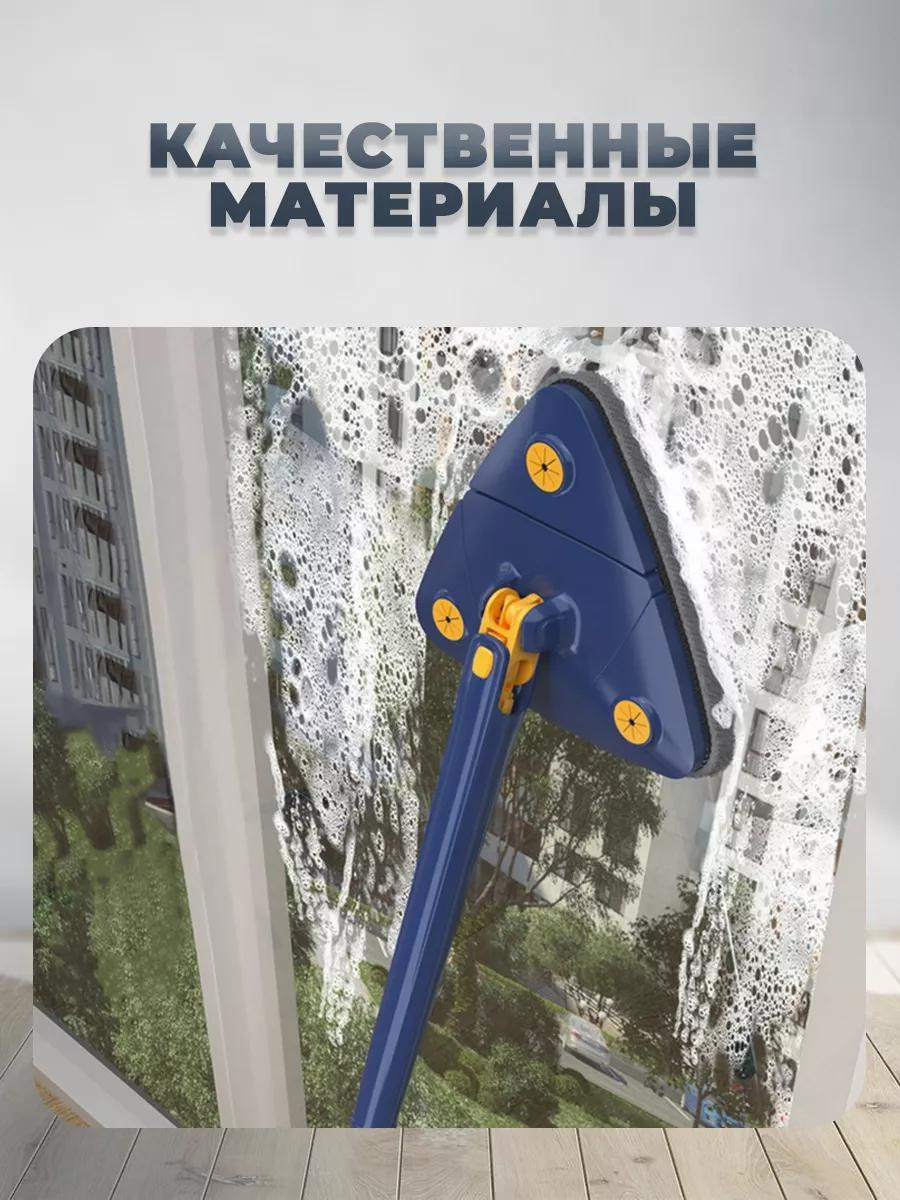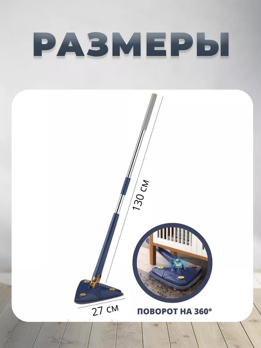 Треугольная вращающаяся швабра с отжимом. Длина швабры - 130 см. Удобная и многофункциональная швабра для пола. Уникальная треугольная вращающаяся на 360 градусов основа на длинной телескопической ручке позволяет легко вытереть пыль из любых труднодоступных мест - щелей, углов, вокруг ножек мебели. Подходит для мытья любых поверхностей - различных покрытий полов, стен, окон, зеркал и даже потолка. Подходит для камня, керамической плитки, ламината твердых пород дерева, винила, бамбука, плинтуса. Телескопическая швабра проста в уходе и очень быстро собирается. Теперь Вам не придётся постоянно пачкать руки при уборке - ведь эта швабра сама умеет отжимать насадку простым поворотом ручки. Качественная насадка из микрофибры отлично собирает грязь и не оставляет разводов и мелкого мусора за собой, хорошо впитывает воду, при этом быстро сохнет. Подходит для сухой уборки. Стирается вручную или в стиральной машинке. Швабра имеет компактные размеры и может храниться вертикально, занимая минимум пространства.