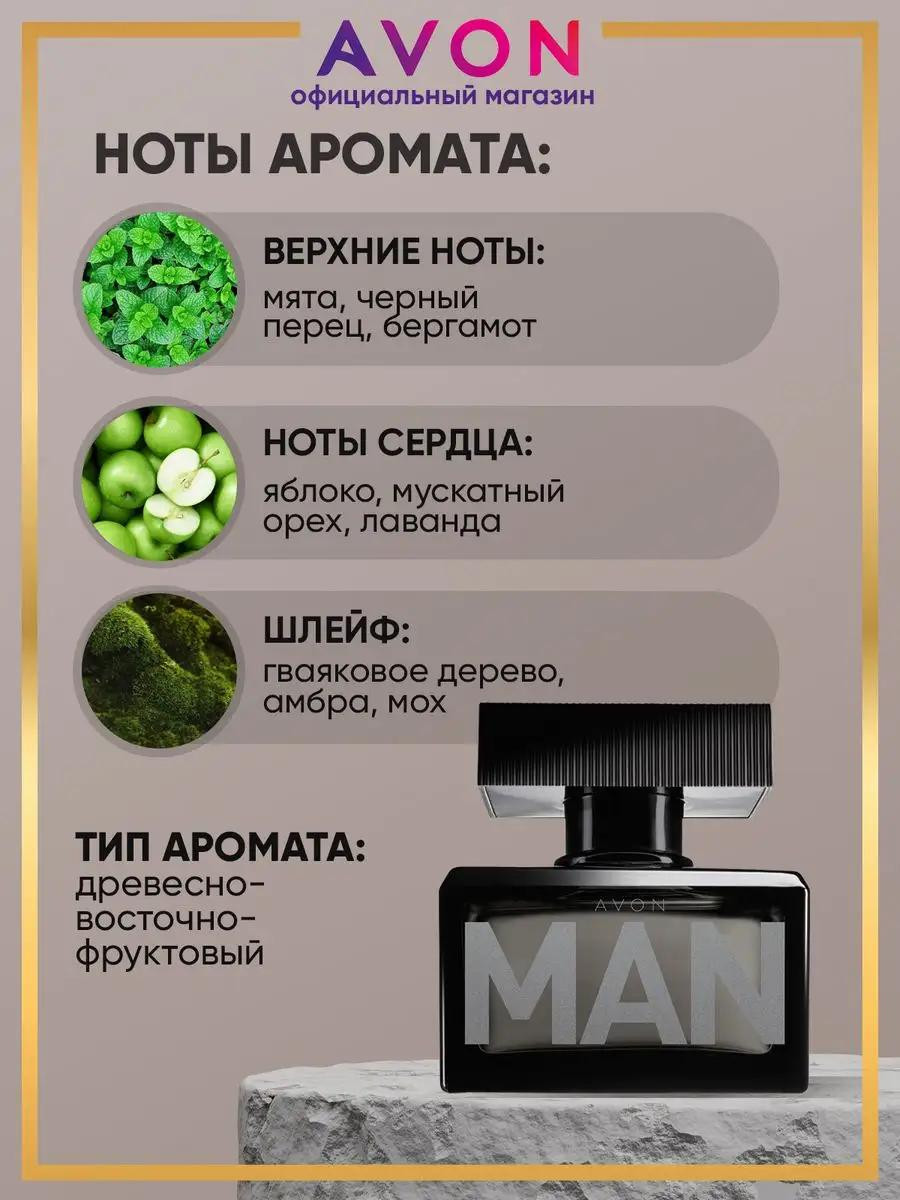 Avon MAN – это сочетание мужественности, силы и уверенности. Древесно-восточная фруктовая композиция раскрывается свежестью мяты, сочного яблока и согревающего мускатного ореха, оставляя за собой стойкий, насыщенный шлейф.