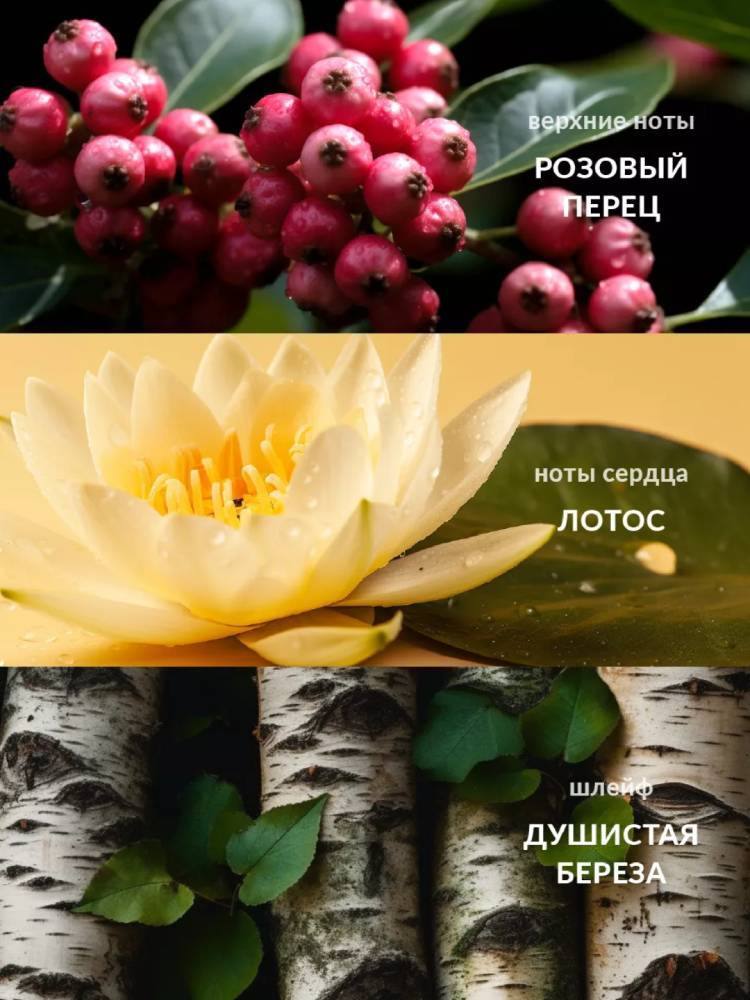 Теплый и расслабляющий аромат, такой же неуловимый как нежные лучи заката, дополненный мягким сочетанием розового перца, сочного лотоса и душистой березы. ТИП АРОМАТА: цветочно-фруктовый НОТЫ: розовый перец, лотос, душистая берез