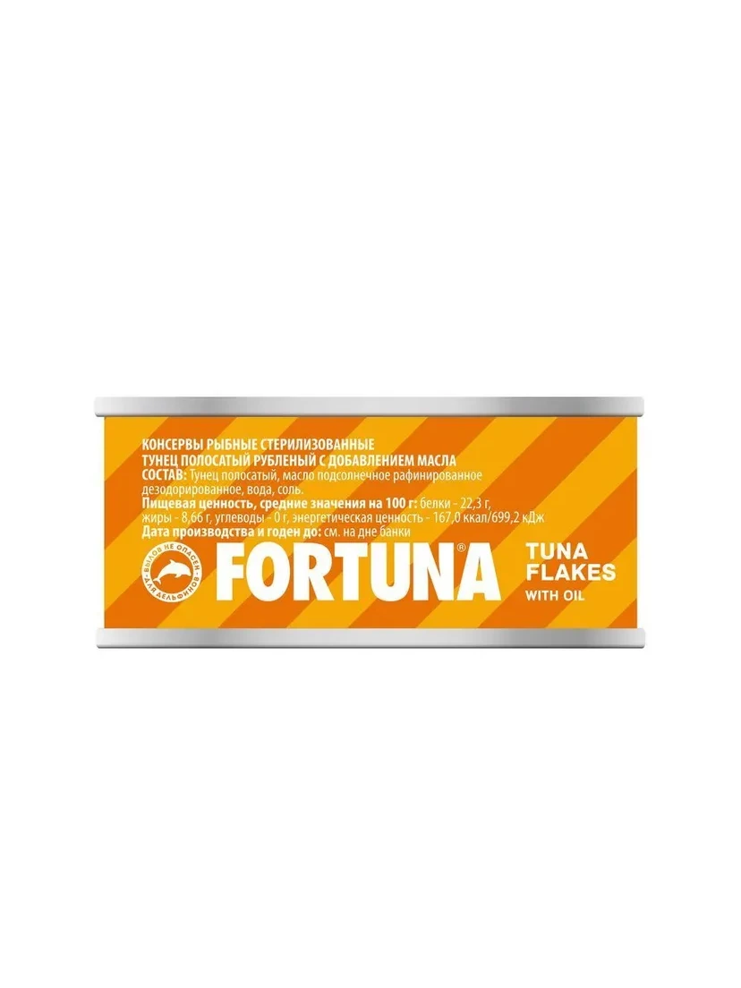 Нежные рубленые кусочки полосатого тунца в ароматном подсолнечном масле — отличное решение для вкусного и полезного питания. Тунец Fortuna сохраняет максимум пользы: богат белком и Омега-3, не содержит углеводов и готов к употреблению. Удобная банка с ключом позволяет брать продукт с собой — на работу, в поездку или на пикник.