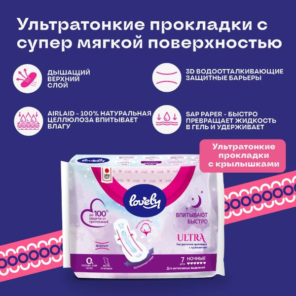 Ультратонкие быстровпитывающие прокладки LOVELY Ultra Night японского стандарта качества подарят ультра комфорт и невидимую защиту на всю ночь. Суперабсорбент SAP поглощает влагу и надежно удерживает ее внутри. Мягчайший верхний слой сделан из экологического материала и не вызывает аллергических реакций. LOVELY - забота с любовью.