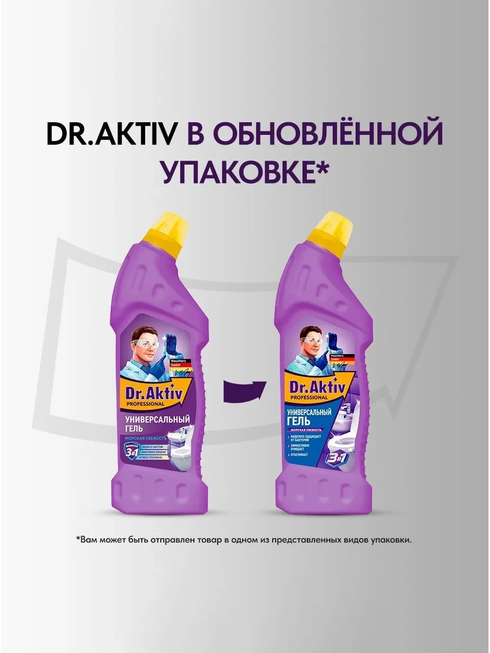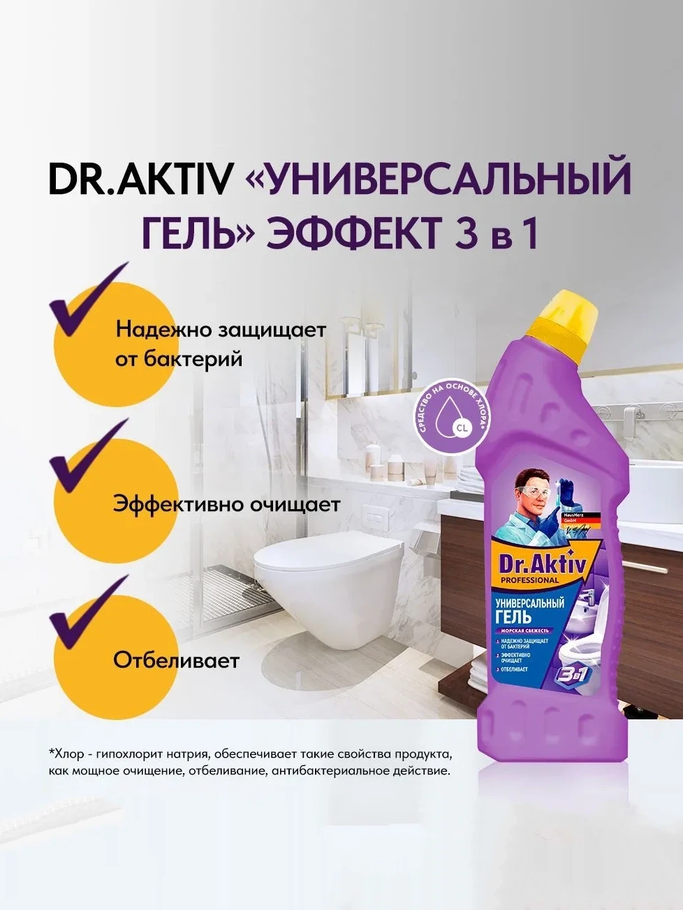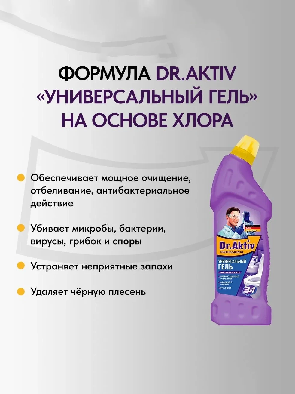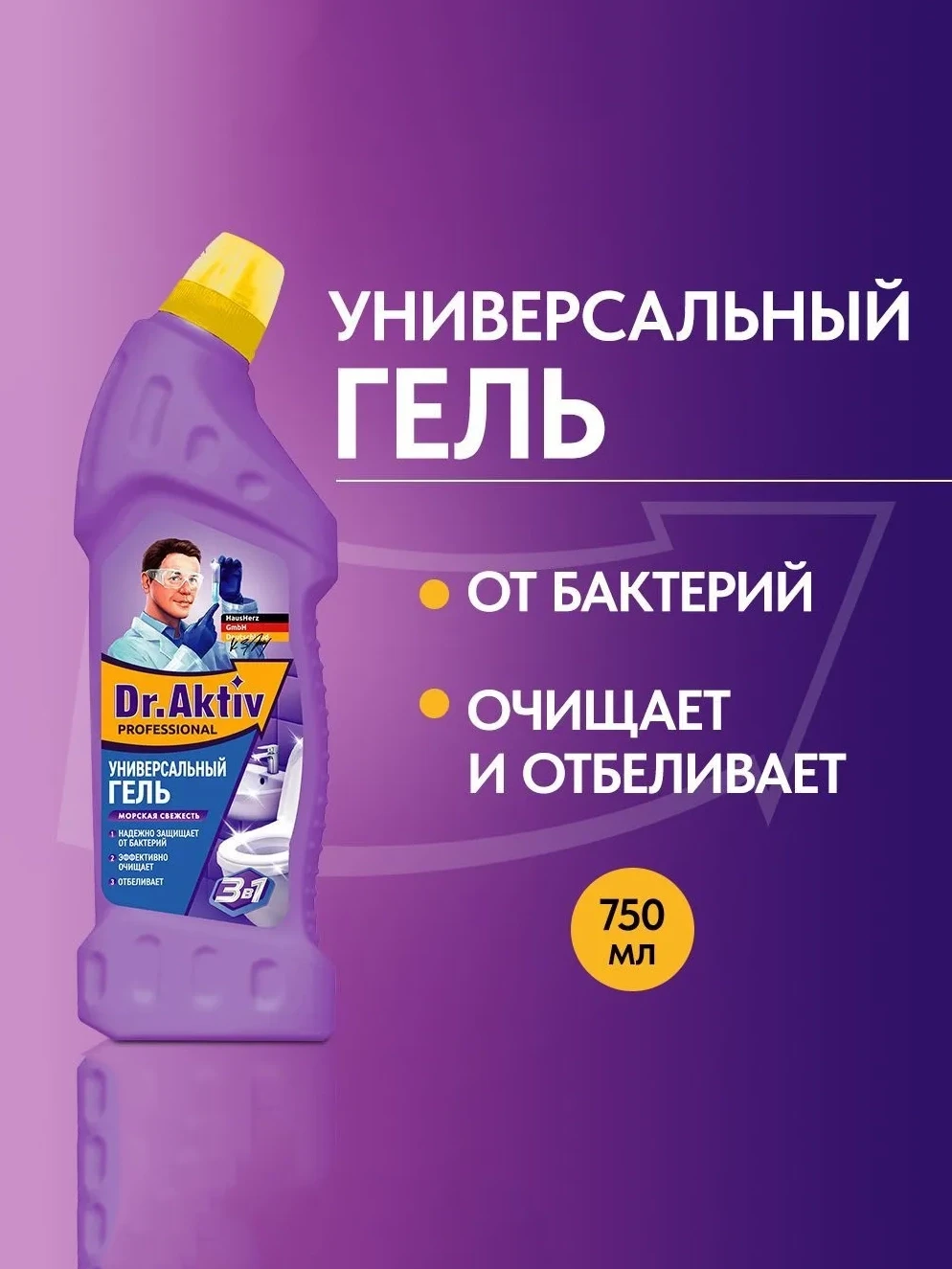 Универсальный гель Dr.Aktiv Professional Морская свежесть 0.75 литров – это чистящее средство, которое поможет вам справиться с уборкой ванны, туалета, раковины, душа и других поверхностей в доме.