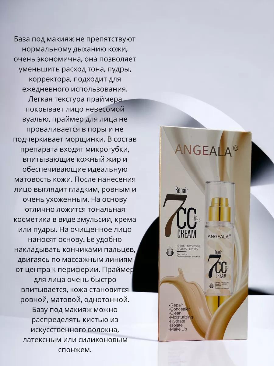 Многофункциональная основа под макияж ANGELA 7CC Cream подготавливает кожу к нанесению тональных средств, увлажняет, матирует и визуально улучшает текстуру кожи. Лёгкая формула скрывает поры, морщины и другие несовершенства, обеспечивая гладкое и ровное покрытие.