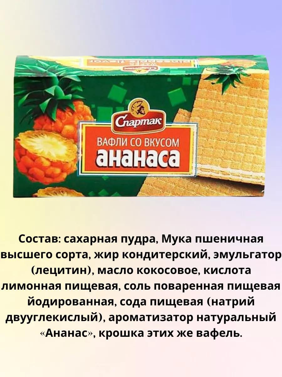 | Состав | сахарная пудра; Мука пшеничная высшего сорта; жир кондитерский; эмульгатор (лецитин); масло кокосовое; кислота лимонная пищевая; соль поваренная пищевая йодированная; сода пищевая (натрий двууглекислый); ароматизатор натуральный «Ананас»; крошка этих же вафель. |