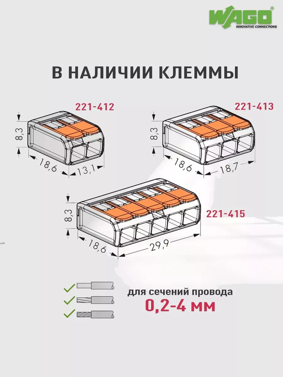 Набор оригинальных клемм соединительных на 2 контакта WAGO 221-412 обеспечивает возможность одновременного подключения до двух проводов, что существенно ускоряет процесс монтажа и повышает его эффективность. Инновационный пружинный зажим: Механизм зажима на основе пружины обеспечивает надежное и прочное соединение с проводами различных типов. Поддерживаемые сечения проводов включают одножильные и многожильные проводники от 0,14 до 4 кв.мм, а также тонкопроволочные проводники от 0,2 до 2,5 кв.мм. Универсальное применение: клемма подходит для различных типов проводов, что делает ее идеальным выбором для широкого спектра электрических установок.