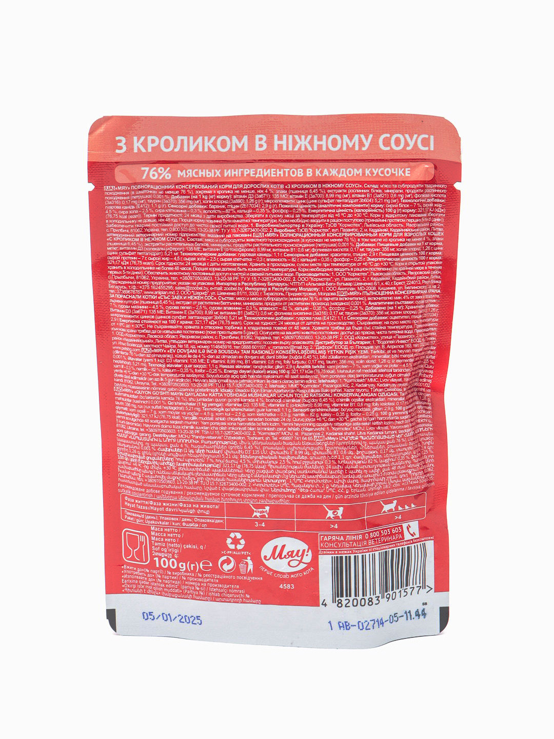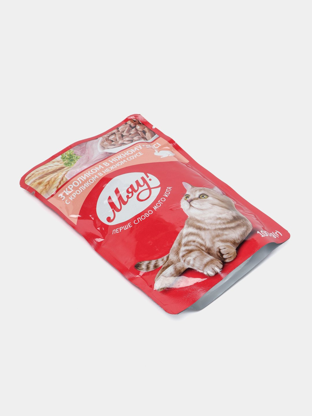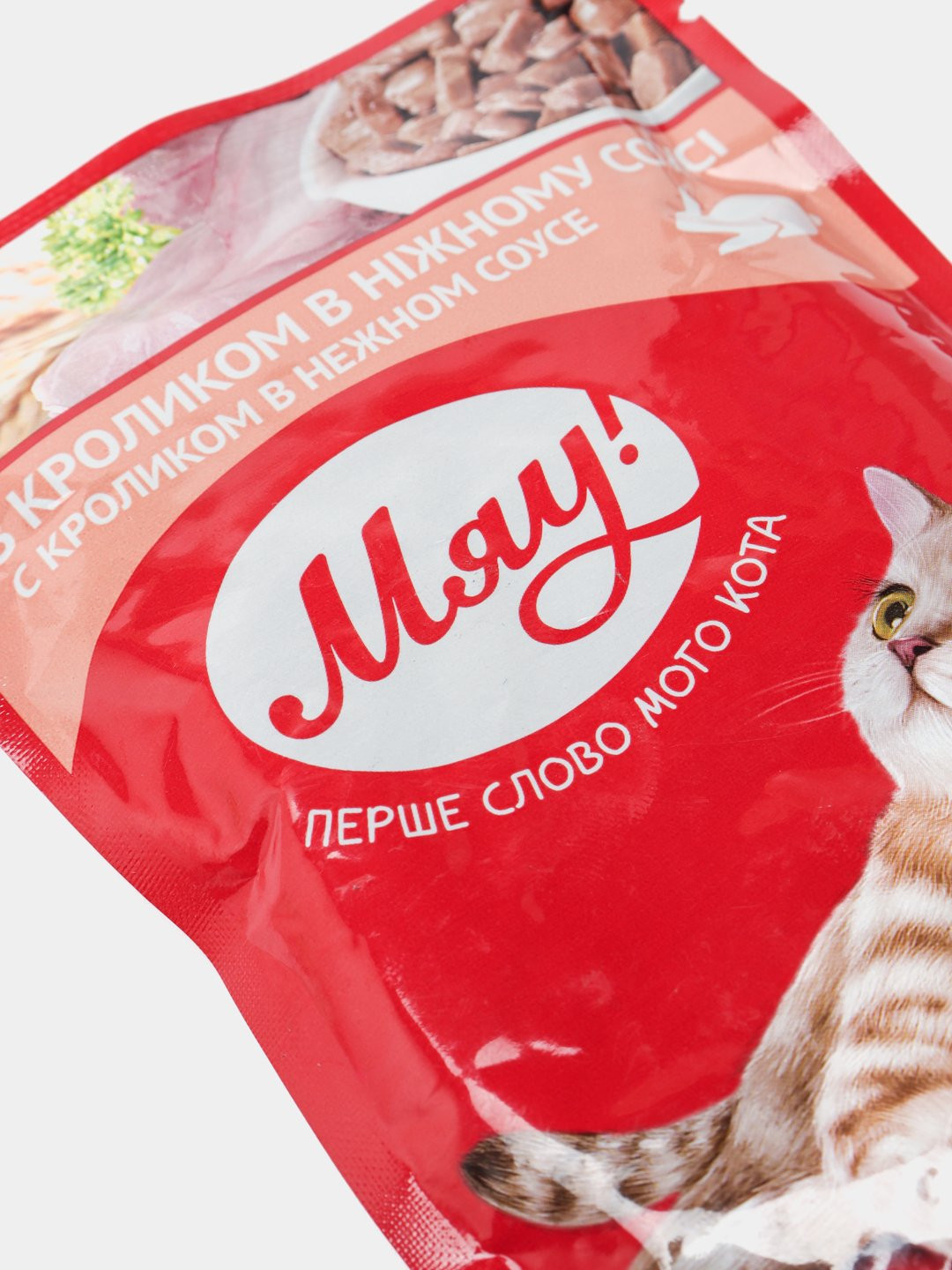 Влажный корм для кошек, МЯУ, пауч с кроликом в нежном соусе, 100 гр, консервированный и влажный корм для котов, является основной и дополнительной пищей в ежедневном рационе.