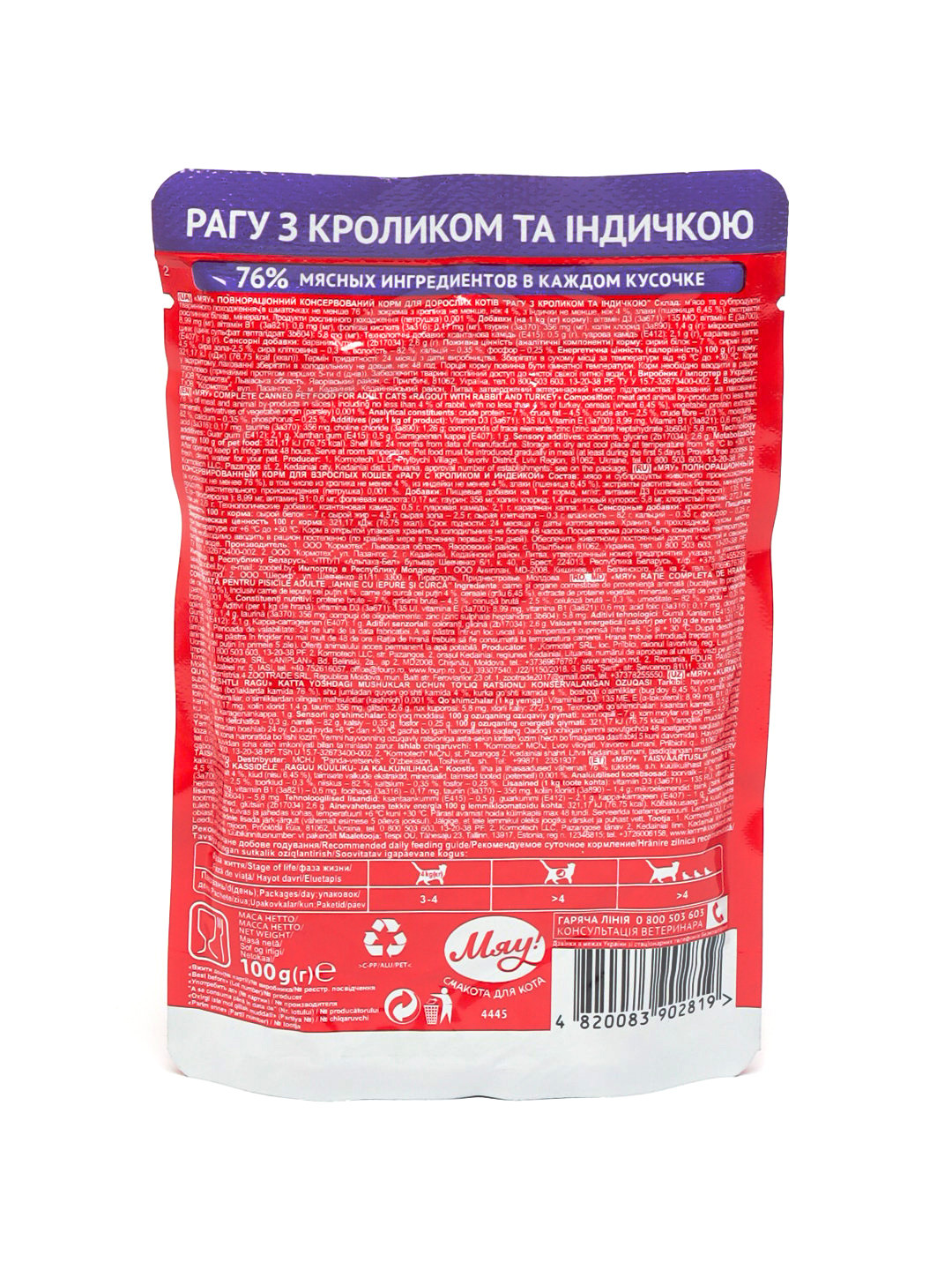 Полнорационный консервированный корм рагу с кроликом и индейкой для взрослых кошек. В основе рецепта формула сбалансированного питания, которая содержит белки, минералы, витамины, таурин и жиры животного происхождения.
