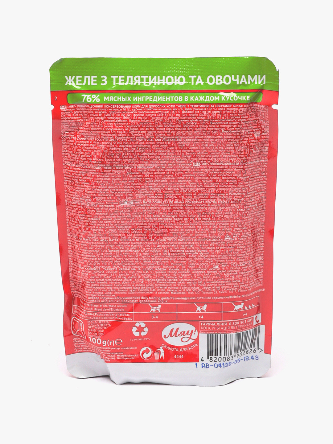 Питательный полнорационный консервированный корм желе с телятиной и овощами. Рекомендован для ежедневного кормления взрослых кошек. Не содержит ГМО, усилителей вкуса и красителей. Дополнительно в корм включены витамины и минералы, а также таурин (аминокислота крайне важна для здоровья кошек, она влияет на остроту зрения).