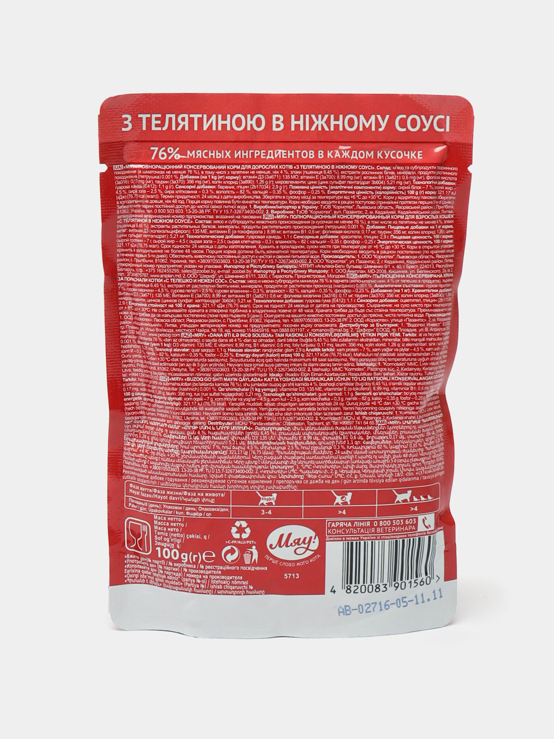 Питательный полнорационный консервированный корм желе с телятиной и овощами. Рекомендован для ежедневного кормления взрослых кошек. Не содержит ГМО, усилителей вкуса и красителей. Дополнительно в корм включены витамины и минералы, а также таурин (аминокислота крайне важна для здоровья кошек, она влияет на остроту зрения) Состав: мясо и субпродукты животного происхождения, в том числе из телятины не менее 4%, злаки, экстракты растительных белков, минералы, витамины (таурин), сахара, краситель Е171. Питательные вещества: белок — 7%, жир — 4.5%, зола — 2.5%, клетчатка — 0.3%, влажность — 82% Содержание витаминов и минералов: витамин А — 1200 МЕ/кг, витамин D3 -160 МЕ/кг, витамин Е — 5 мг/кг, кальций — 0.35%, фосфор — 0,25%. Содержит витамины В1