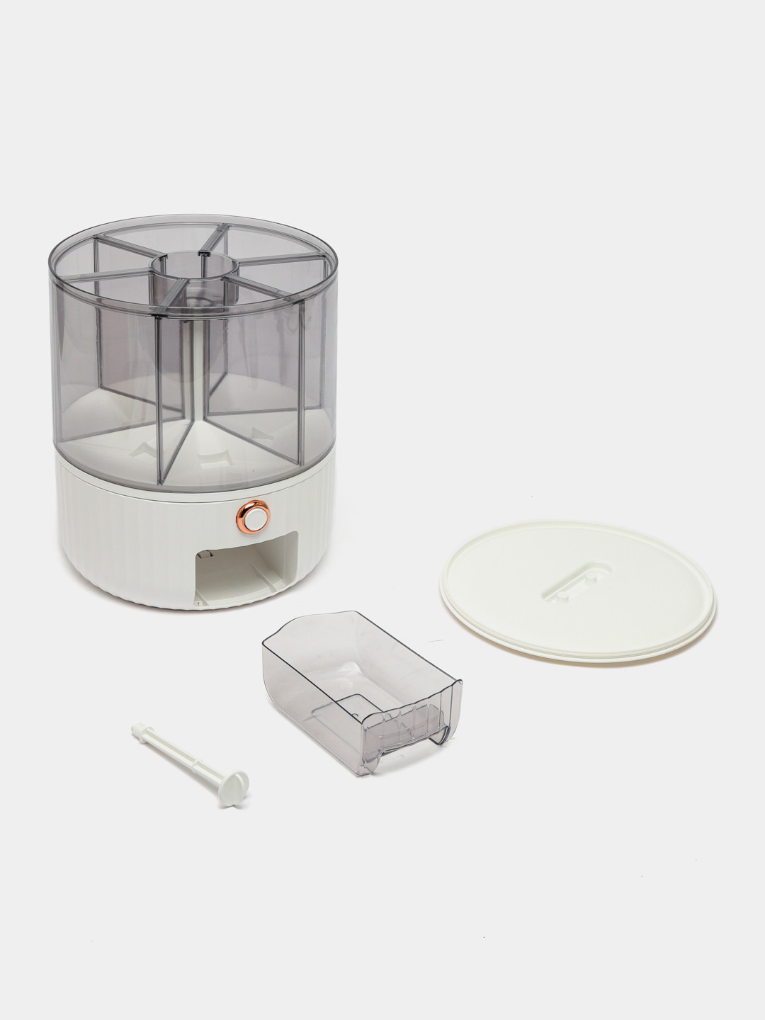 Шестисекционный вращающийся на 360 градусов диспенсер поможет Вам забыть о множестве разных пакетиков, коробочек, баночек из которых все высыпается. Универсальный, многосекционный диспенсер подойдет для различных сыпучих продуктов таких как: крупы, хлопья, сухие завтраки, сахар, кофе, чаи, макароны, орехи и многое другое. Пользоваться диспенсером очень просто - зажмите кнопку под нужным продуктом и насыпьте нужный продукт в мерную ёмкость столько, сколько Вам нужно. Благодаря прозрачному корпусу, Вы всегда контролируете наполненность диспенсера, а вращающийся на 360 градусов дизайн поможет выбрать все, что хотите, всего за один поворот В дозаторе предусмотрен отсек в центре для защиты от насекомых (можно использовать дольку чеснока, лавровый лист, цедру лимона или гвоздику) Кухонный органайзер дозатор - это многоразовый пластиковый контейнер, который впишется в любой интерьер и поможет поддерживать порядок и чистоту на кухне
