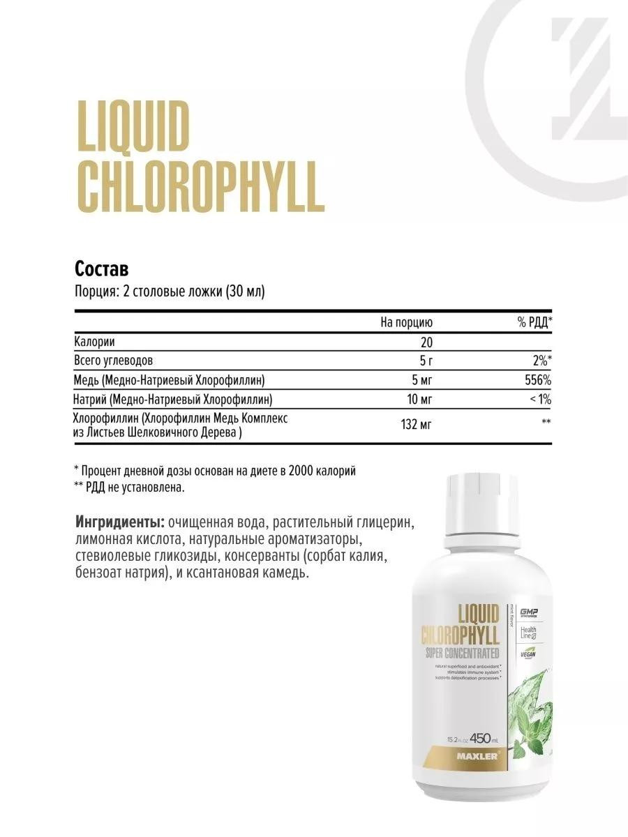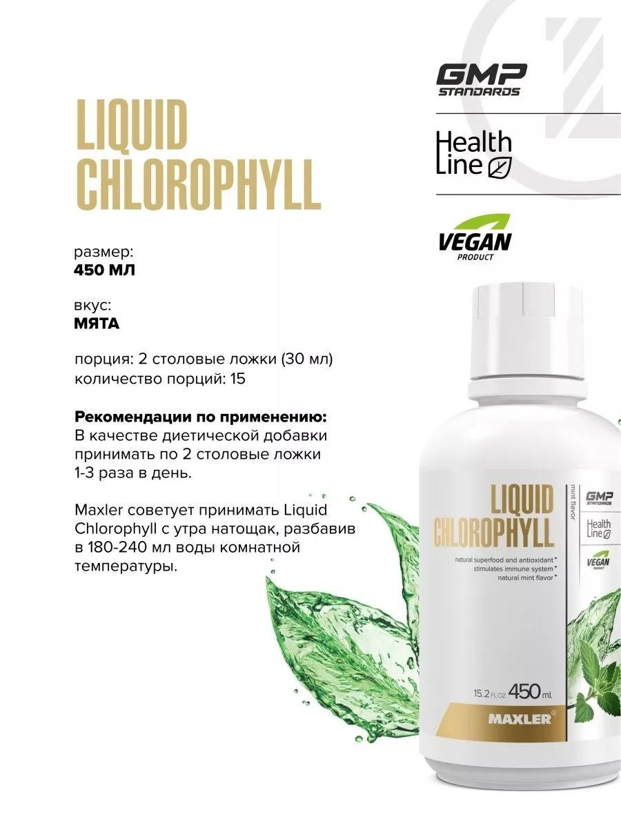 Maxler Liquid Chlorophyll 450 мл со вкусом Мяты. Вещество, придающее овощам зеленый цвет – хлорофилл, который может принести много пользы организму человека, так как он содержит огромное количество витаминов и минералов.Liquid Chlorophyll от Maxler получен из листьев шелковицы, благодаря чему не имеет противопоказаний в отличии от хлорофилла, источником которого является люцерна. Liquid Chlorophyll представлен в жидкой форме, что делает продукт легко усвояемым для организма. Также плюсом жидкой формы является тот факт, что продукт проходит через ротовую полость, гортань, пищевод, оказывая антибактериальное и противовоспалительное действия. Хлорофилл укрепляет иммунитет и помогает бороться со старением.Хлорофилл является мощным природным антиоксидантом, который выводит из организма токсины и свободные радикалы, помогая бороться со старением и повышая иммунитет. Хлорофилл поддерживает нормальную работу кишечника.Хлорофилл стимулирует работу кишечника и улучшает работу пищеварительного тракта. Помогает бороться с такими пищеварительными проблемами как повышенное газообразование, вздутие живота, повышенная кислотность. Хлорофилл насыщает кровь кислородом и ускоряет азотный обмен.