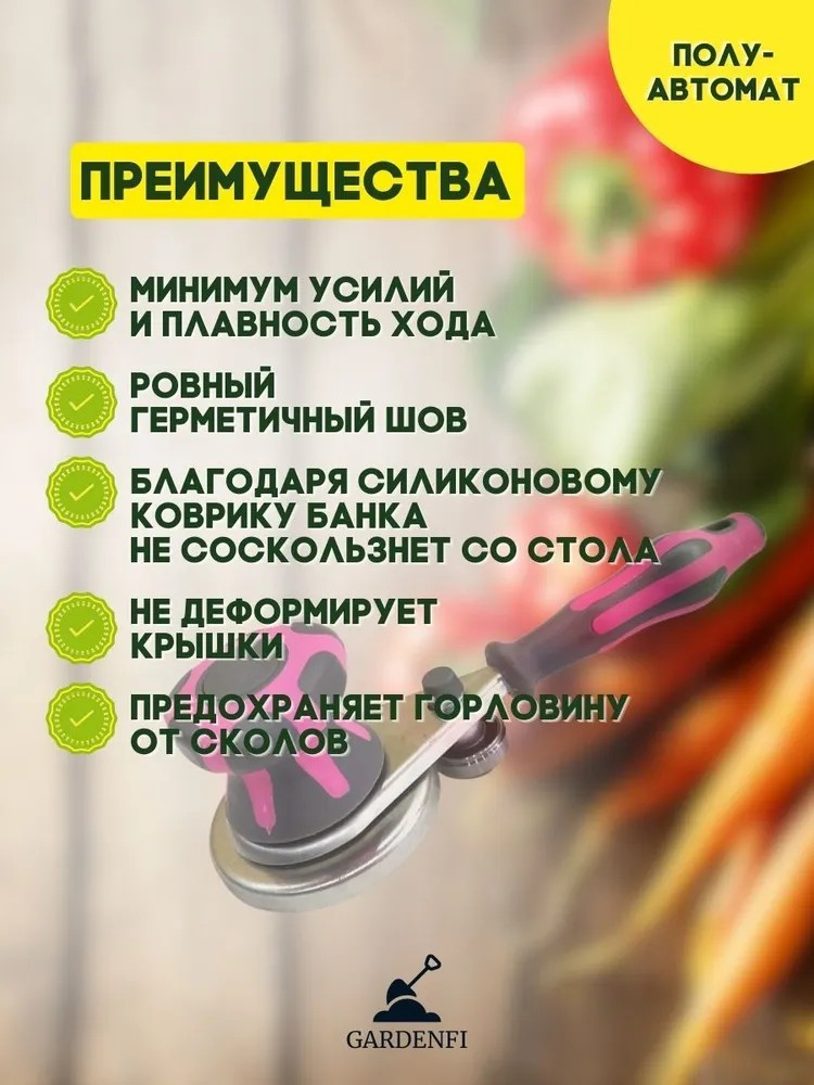 Конструкция закаточной машинки разработана еще в СССР и уже проверена годами. Эргономичная ручка, прорезиненные детали позволяют кулинарам быстро и легко делать консервацию. На закатку одной банки потребуется около 10 секунд!