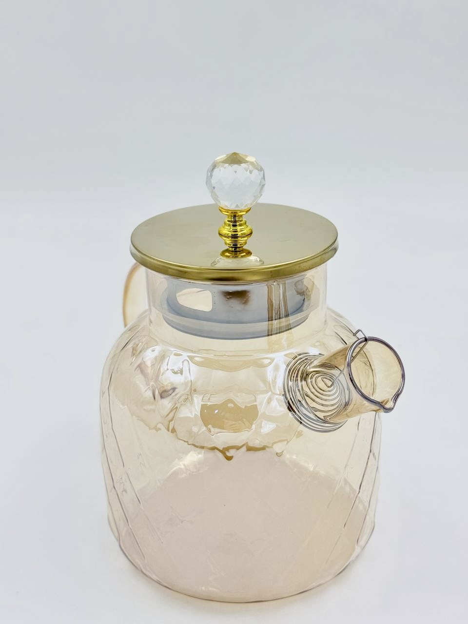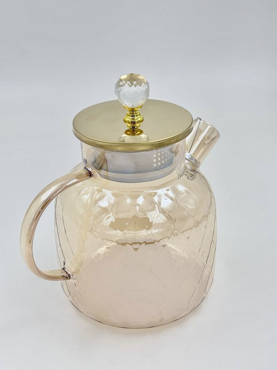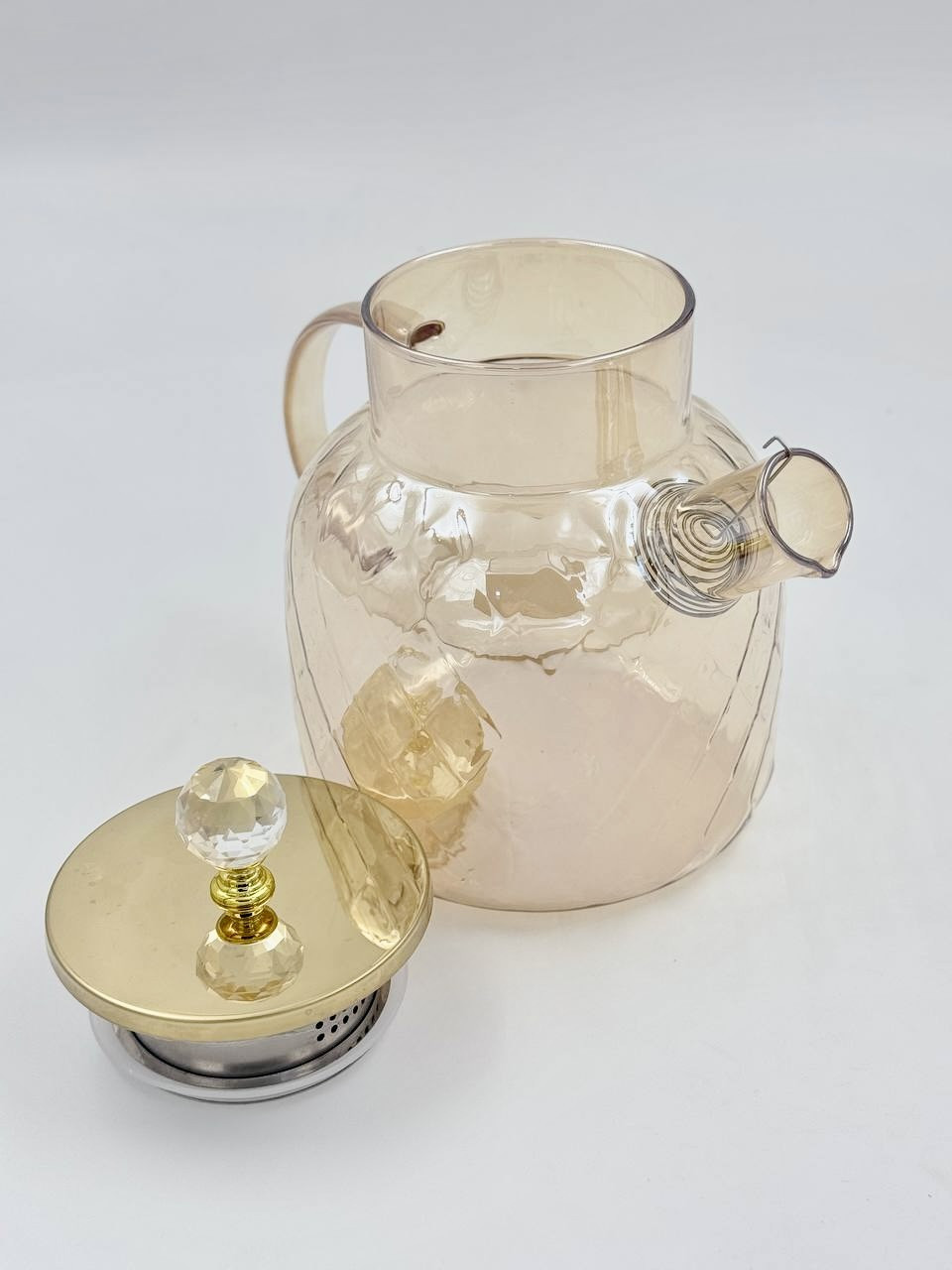 Элегантный чайник с золотистой крышкой и стеклянной ручкой идеально подойдёт для заваривания чая, трав и фруктовых настоев. Выполнен из прочного термостойкого стекла, не впитывает запахи и сохраняет натуральный вкус напитка. Металлический фильтр эффективно удерживает листья, а изящная крышка с кристаллом придаёт стильный акцент.