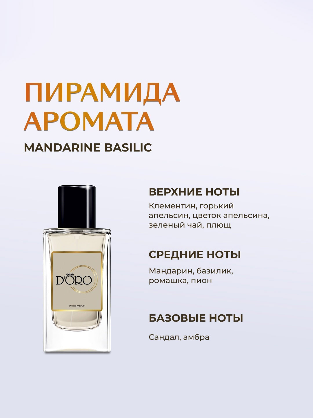 D'ORO WOMEN — это легкий и освежающий аромат, наполненный солнечным сиянием и радостью жизни. Яркие ноты спелого мандарина гармонично сочетаются с ароматным базиликом и нежной зеленью, создавая бодрящий и жизнерадостный шлейф. Идеально подходит для теплого времени года, наполняя день свежестью и энергией.