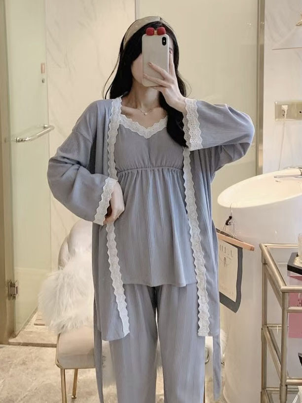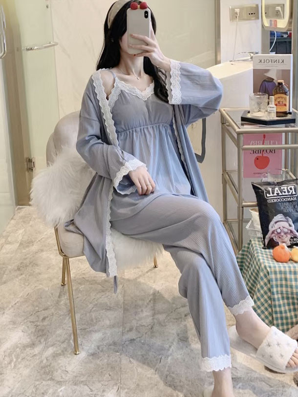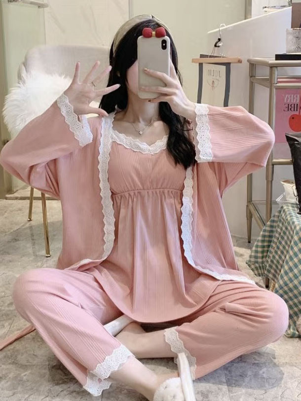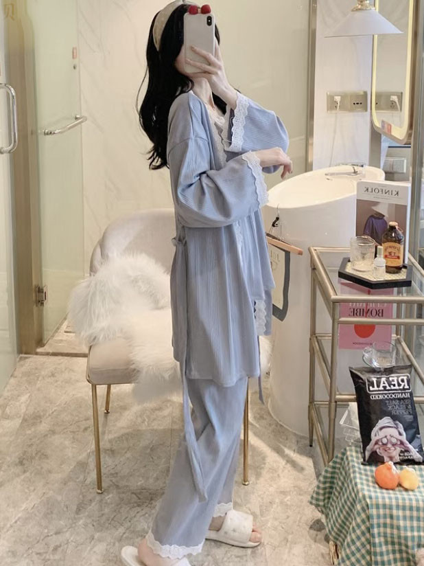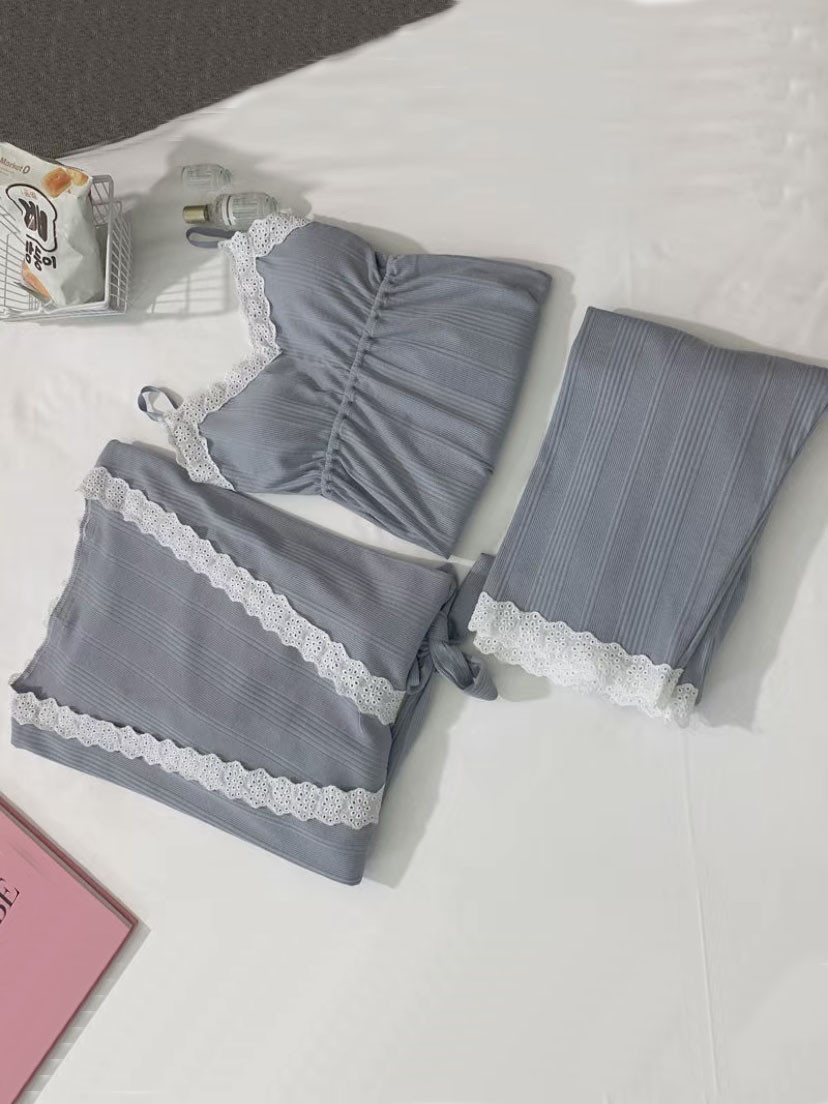 Уютный и стильный комплект для дома из трех предметов: легкая кофточка, топ с кружевной отделкой и брюки. Идеально подходит для комфортного отдыха и сна.