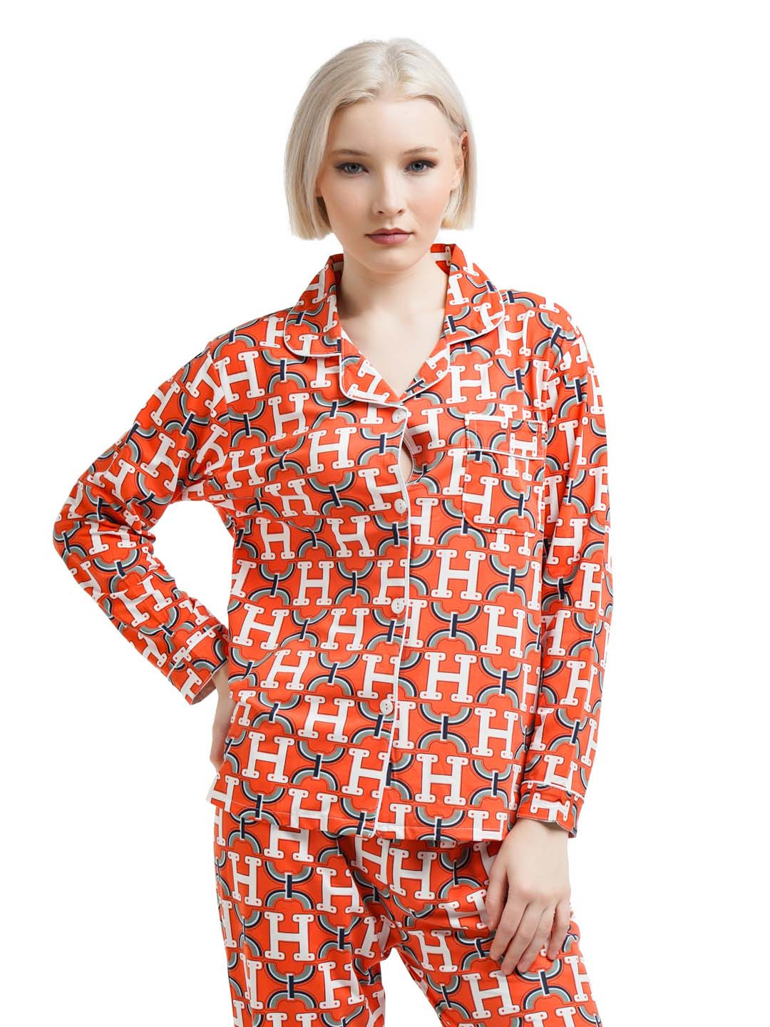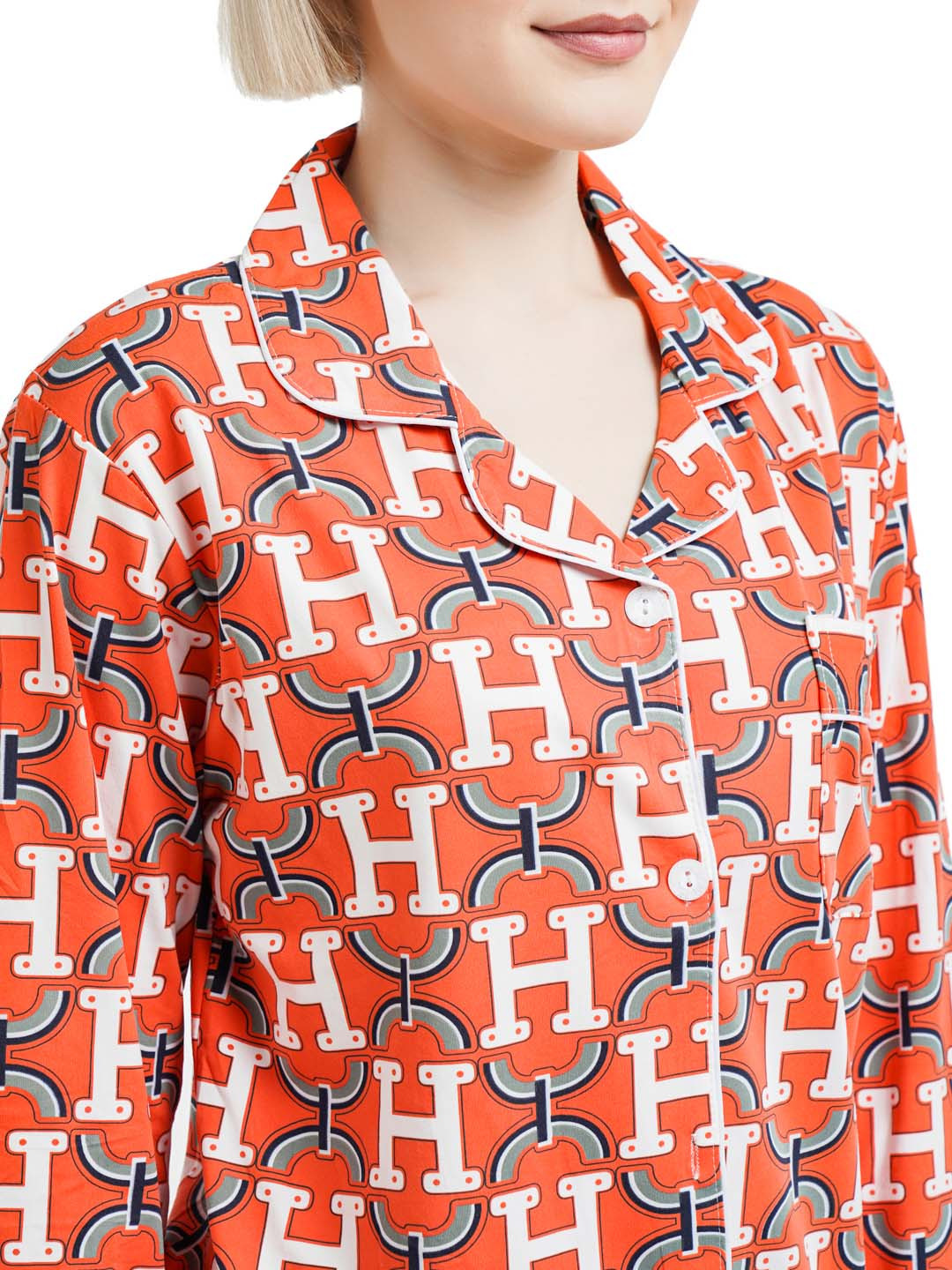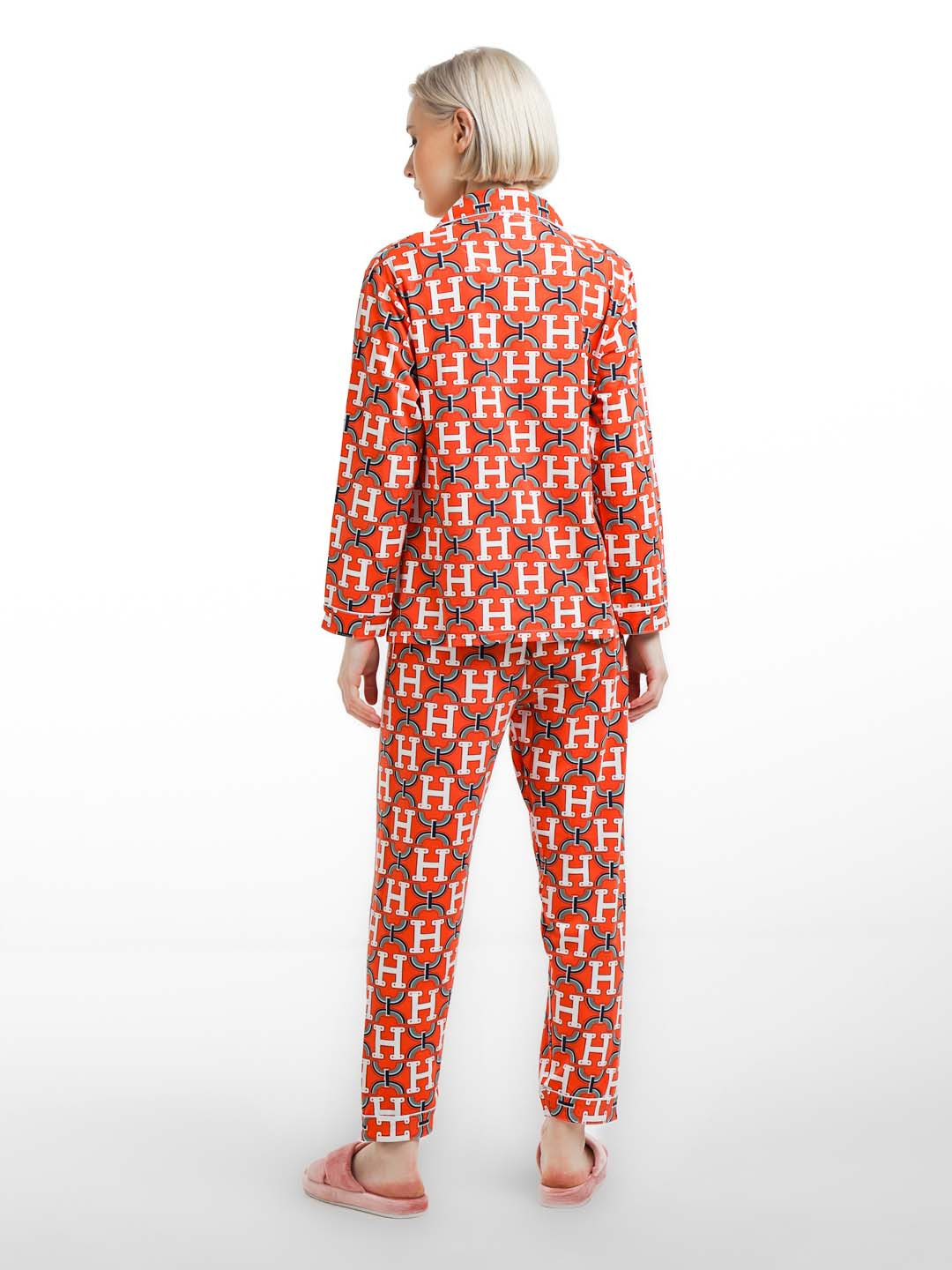 Эта женская пижама из 100% хлопка сочетает комфорт и стиль. Яркий оранжевый принт с логотипом в виде буквы "H" добавляет эффектности и современности дизайну. Комплект состоит из рубашки с длинным рукавом и классическим воротником, а также брюк прямого кроя.