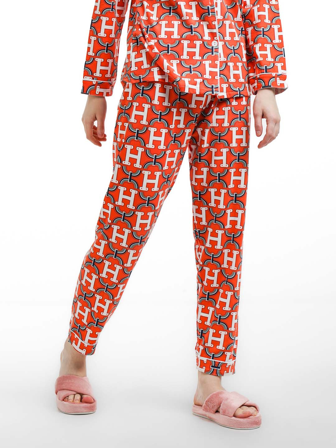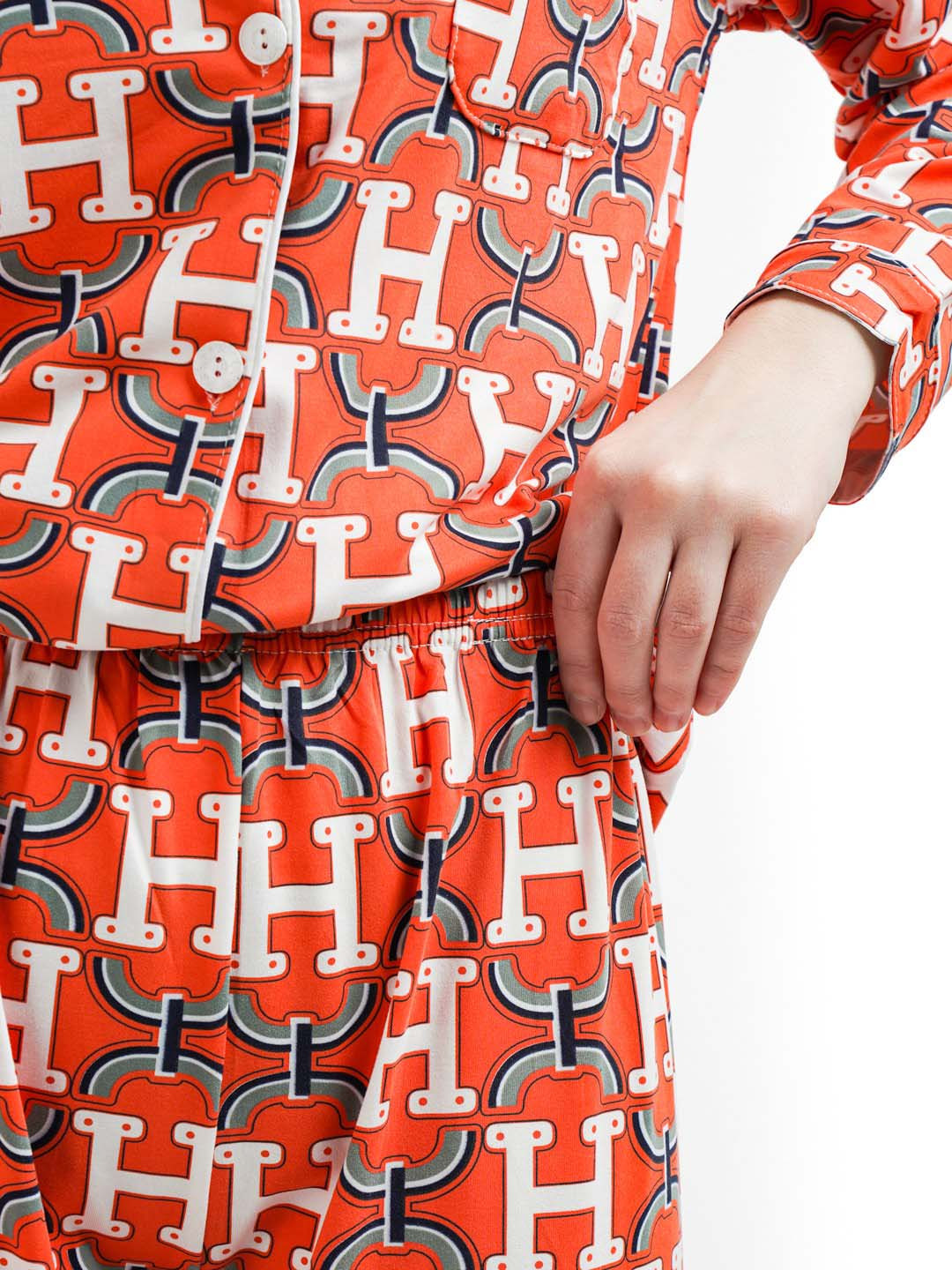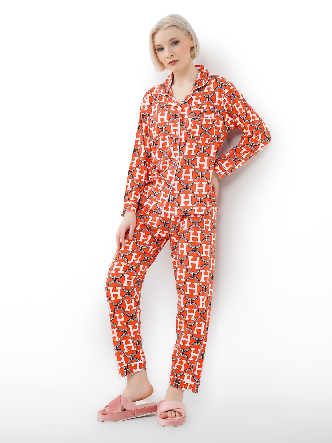 Эта женская пижама из 100% хлопка сочетает комфорт и стиль. Яркий оранжевый принт с логотипом в виде буквы "H" добавляет эффектности и современности дизайну. Комплект состоит из рубашки с длинным рукавом и классическим воротником, а также брюк прямого кроя.