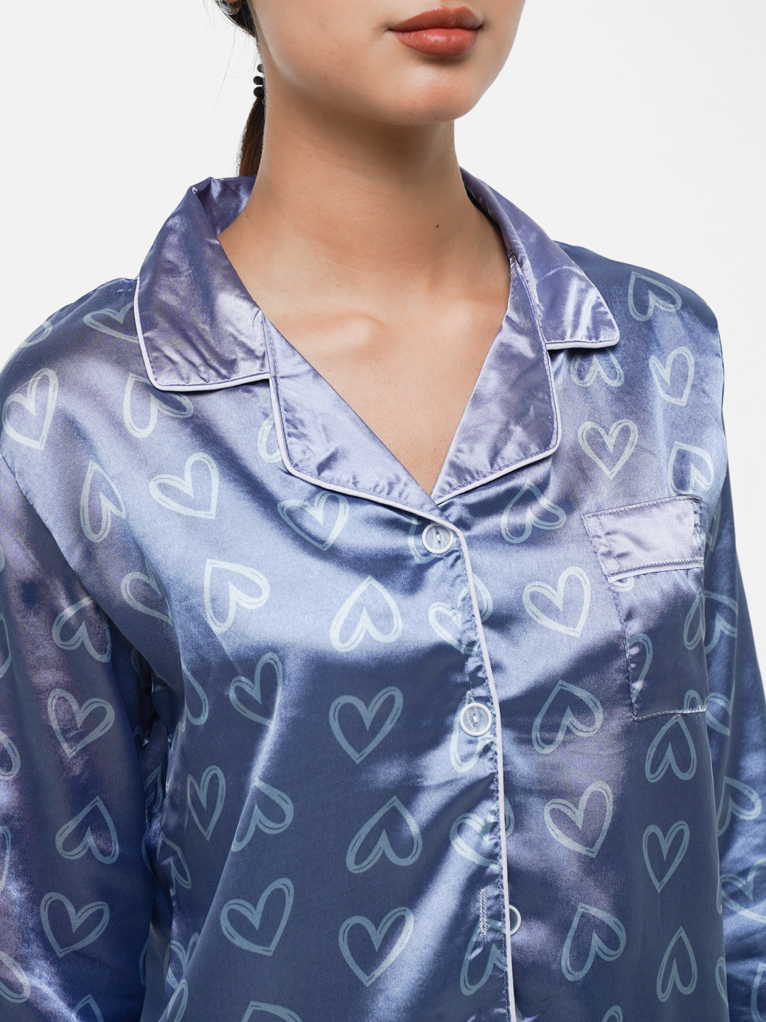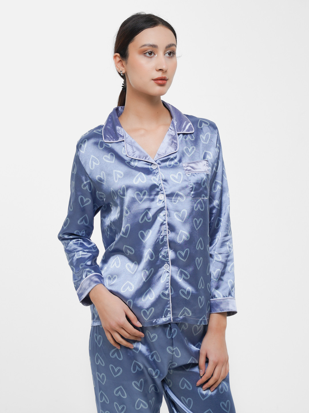 Элегантный комплект из гладкого атласа — рубашка с отложным воротником, нагрудным карманом и застёжкой на пуговицы, а также прямые брюки средней посадки. Мягкий блеск ткани и романтичный принт в виде контурных сердечек создают утончённый образ для уютного сна и домашнего отдыха. Манжеты и края отделаны кантом.