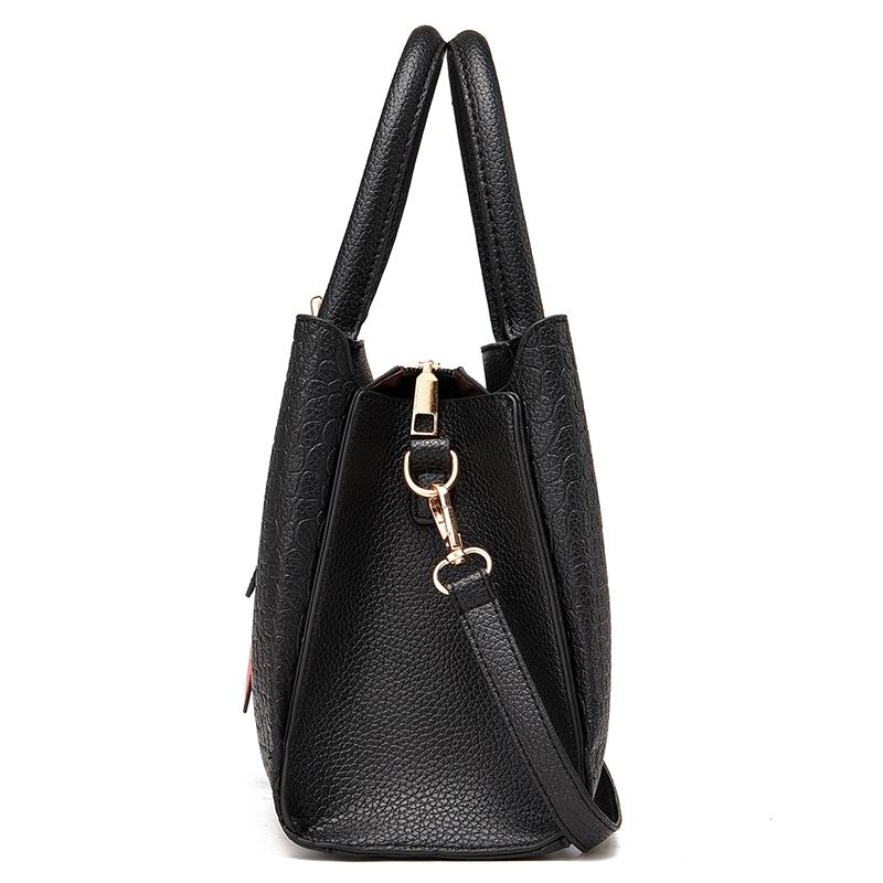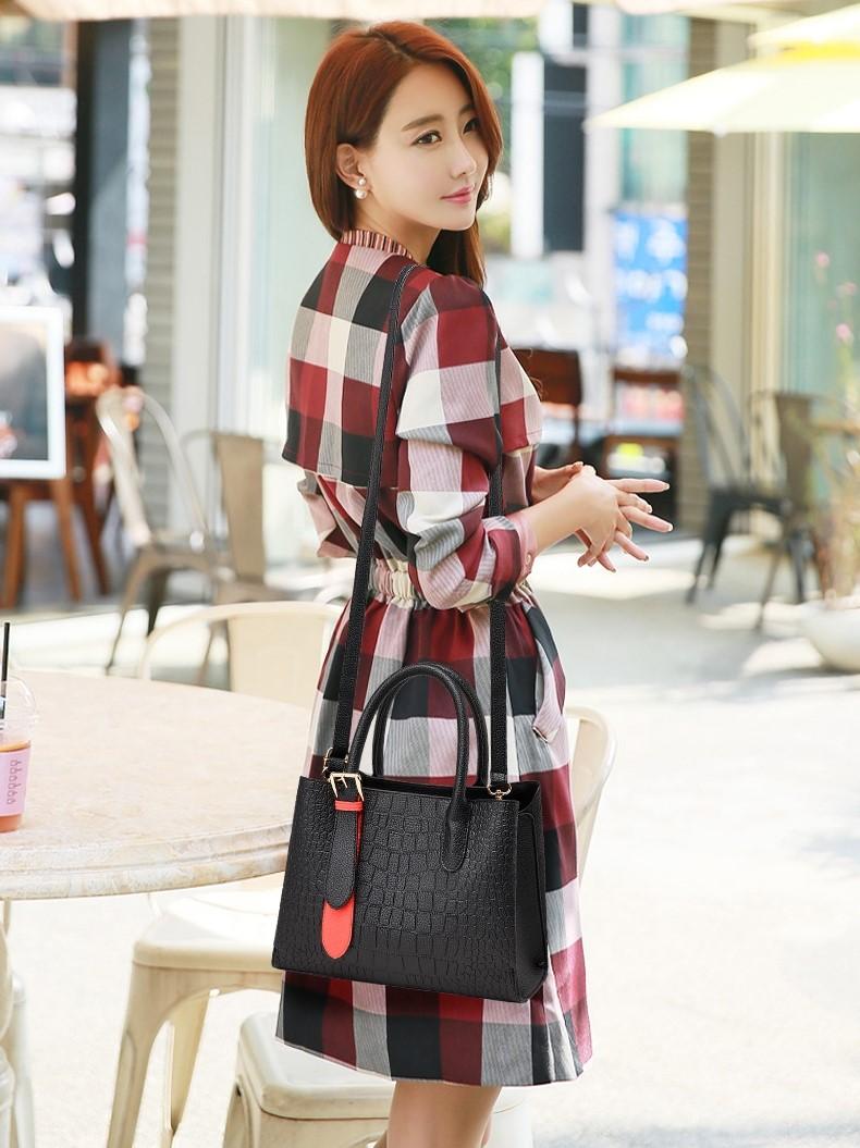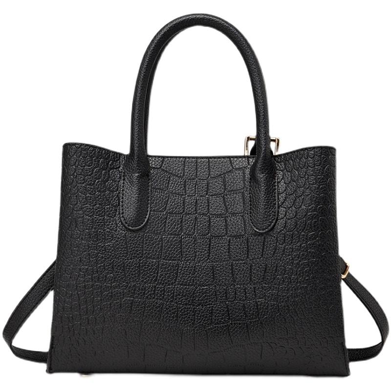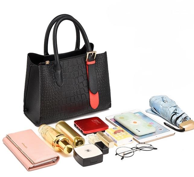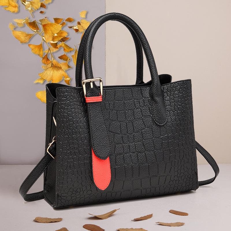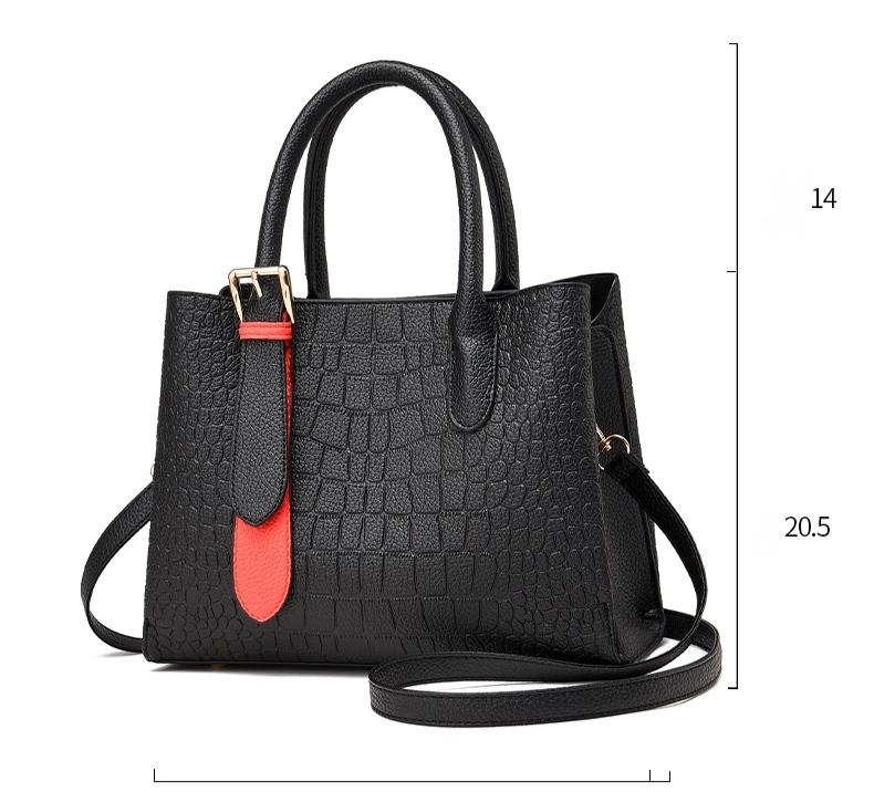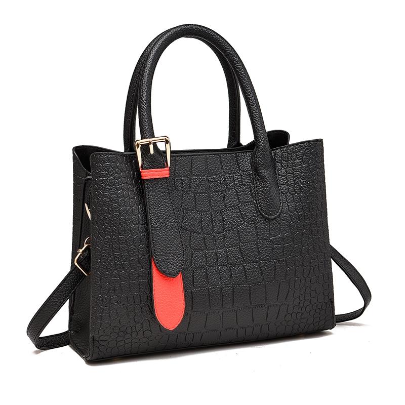 Стильная женская сумка из искусственной кожи с тиснением под крокодила в классическом черном цвете. Эффектный акцент — контрастная деталь красного цвета с золотистой пряжкой, которая добавляет оригинальности и изысканности. Модель оснащена удобными короткими ручками и съемным регулируемым плечевым ремнем, что обеспечивает максимальную функциональность. Сумка идеально подойдет для делового стиля или вечерних выходов, сочетая элегантность и практичность.