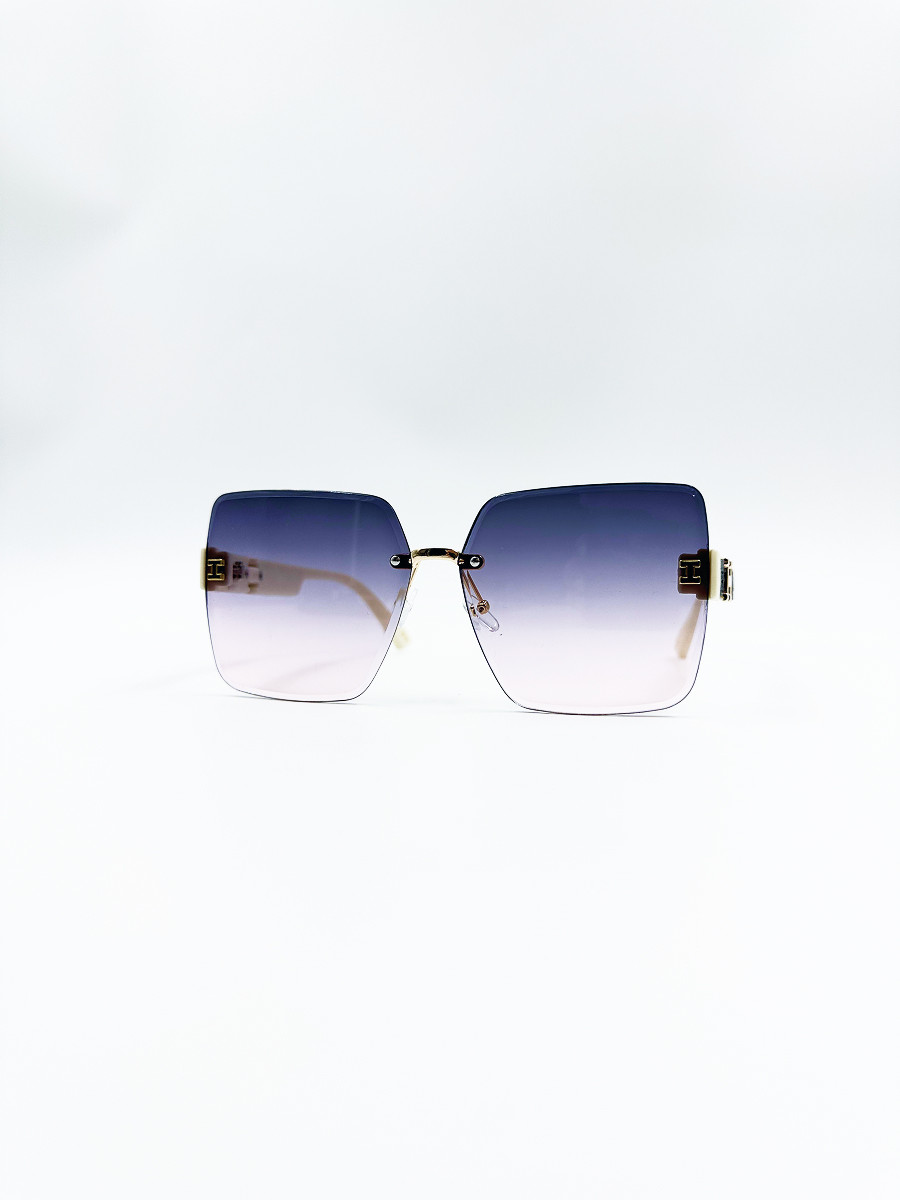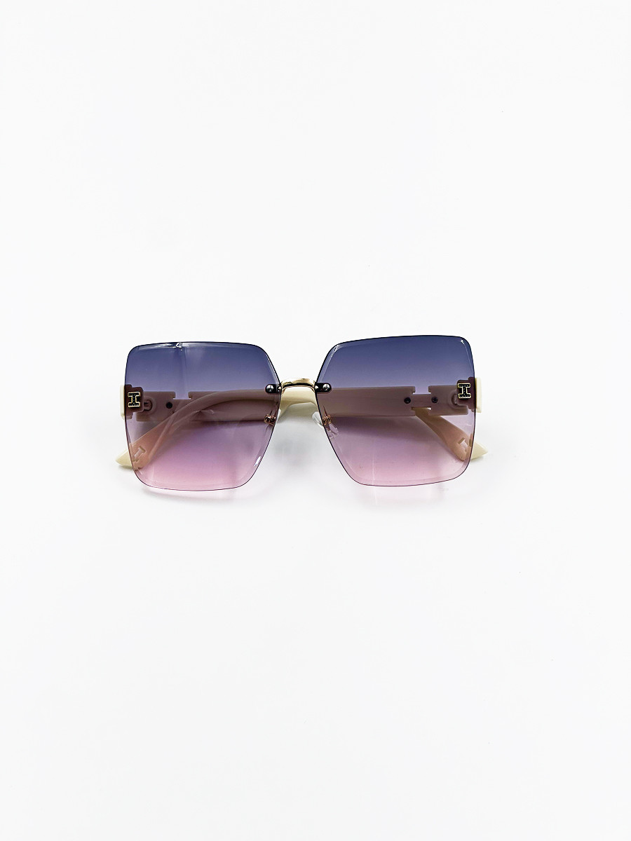 Эффектные солнцезащитные очки с безободковой прямоугольной формой линз. Плавный градиент от тёмно-фиолетового к светло-розовому придаёт образу лёгкость и утончённость. Белые заушники с золотыми акцентами подчёркивают элегантность и делают модель особенно выразительной. Прекрасный выбор для модных летних выходов и фотосессий.