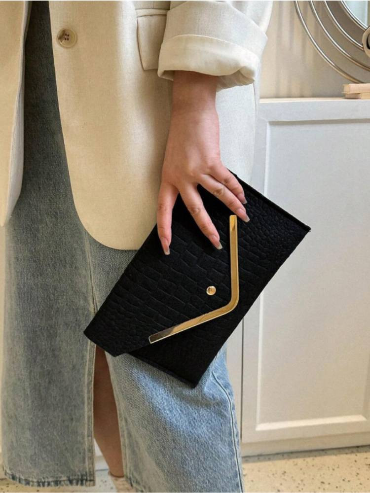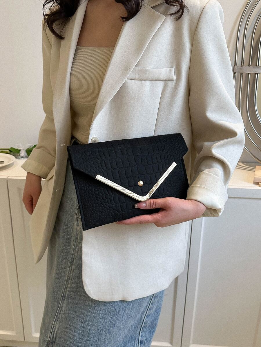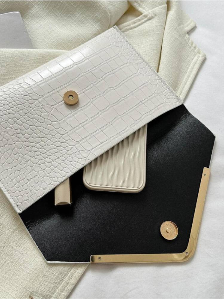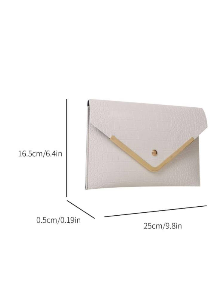 Ультрамодный клатч в форме конверта выполнен из качественной эко-кожи с тиснением под крокодила. Минималистичный и в то же время эффектный дизайн дополнен металлическим V-декором и золотистой кнопкой. Идеален для торжеств, вечеринок, свиданий и формальных мероприятий. Вмещает телефон, карточки, ключи и другие мелочи. Носится в руке или как портмоне.