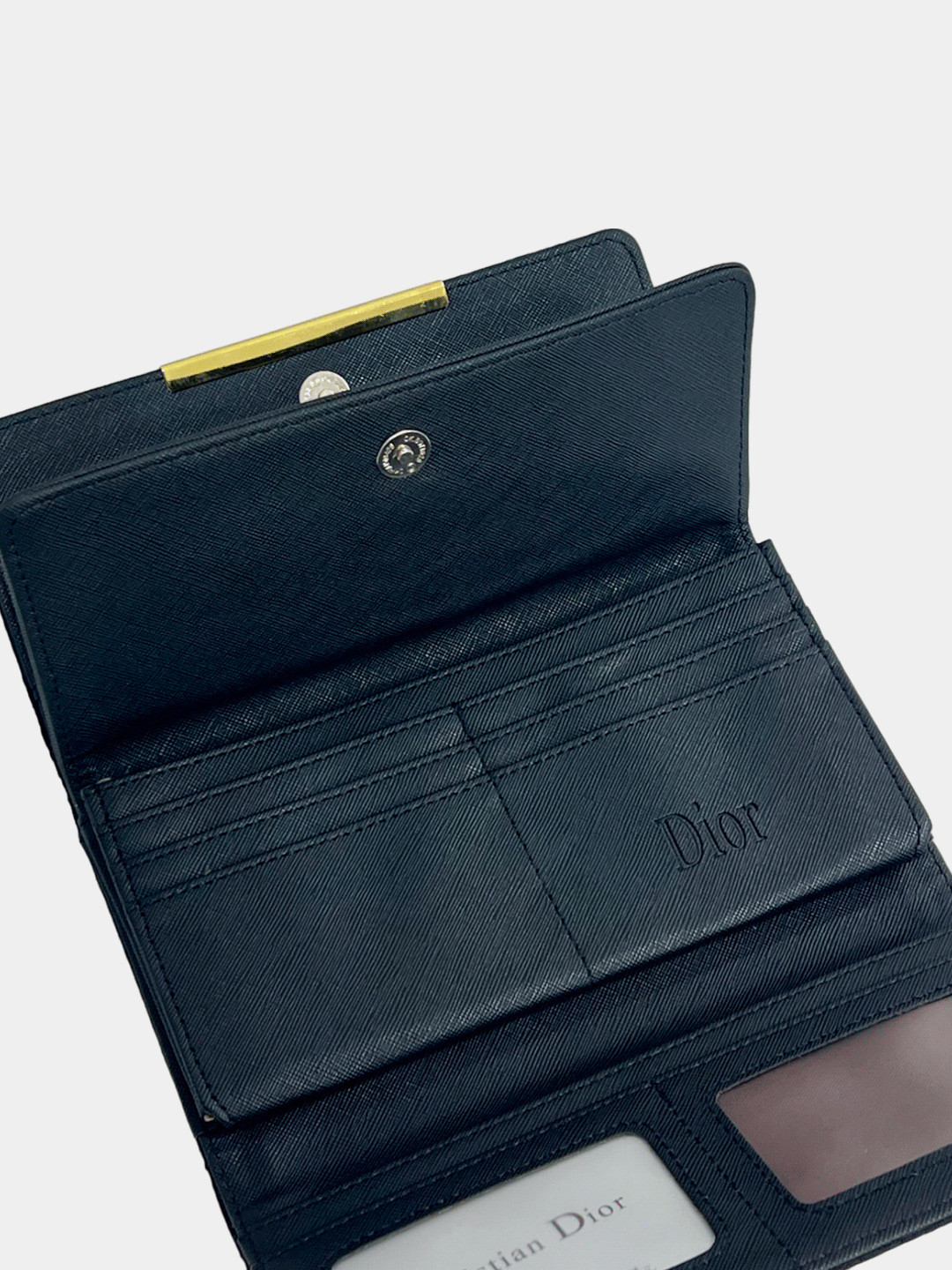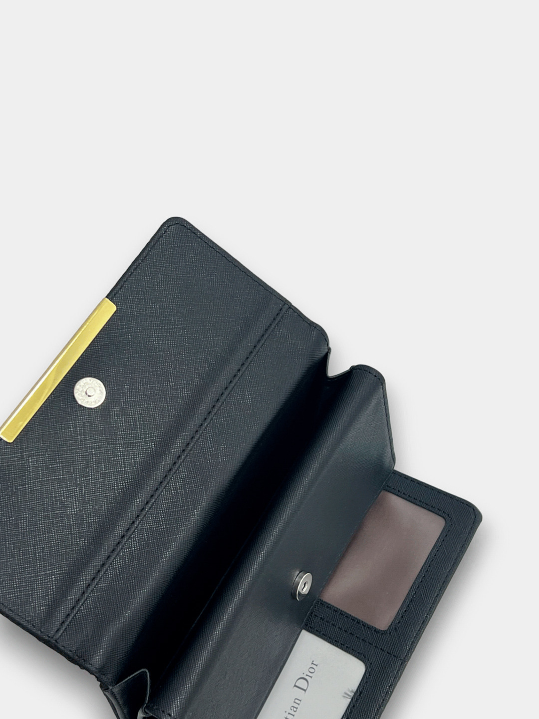 Элегантный кошелёк Dior в чёрном цвете с золотистой фурнитурой и фирменной гравировкой. Выполнен из плотного текстиля с тиснением логотипа бренда. Имеет стильную защёлку и два вместительных отделения, включая отделение на молнии и секции для карт. Идеальный выбор для стильных и практичных женщин.