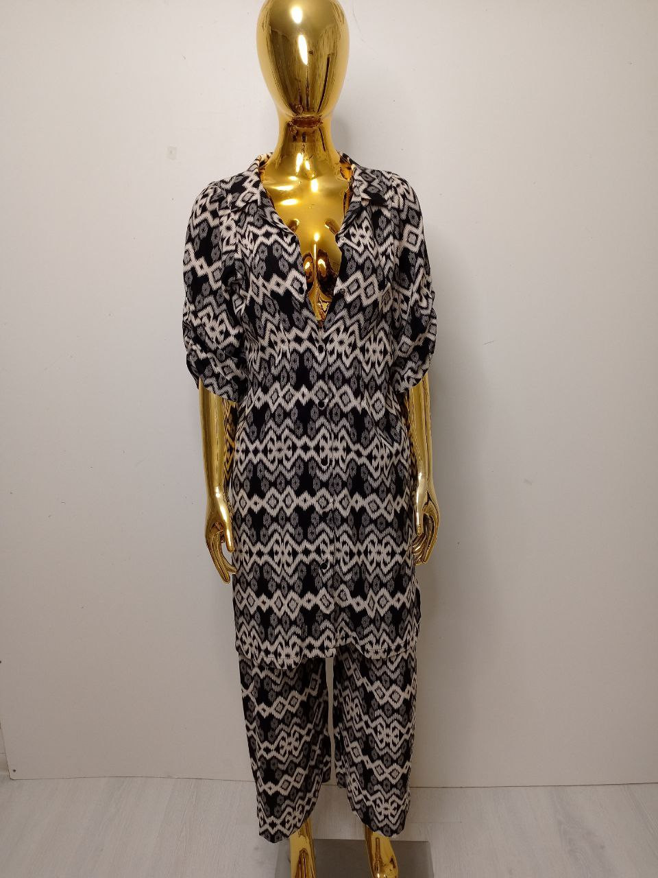 Превратите каждый свой день в небольшое торжество красоты и удобства с этим ярким и свободным нарядом. Его сочные краски и изящный узор привнесут атмосферу праздника в ваш дом, а просторный фасон обеспечит полную свободу движений, делая его идеальным спутником для любых домашних дел или расслабленного отдыха.
