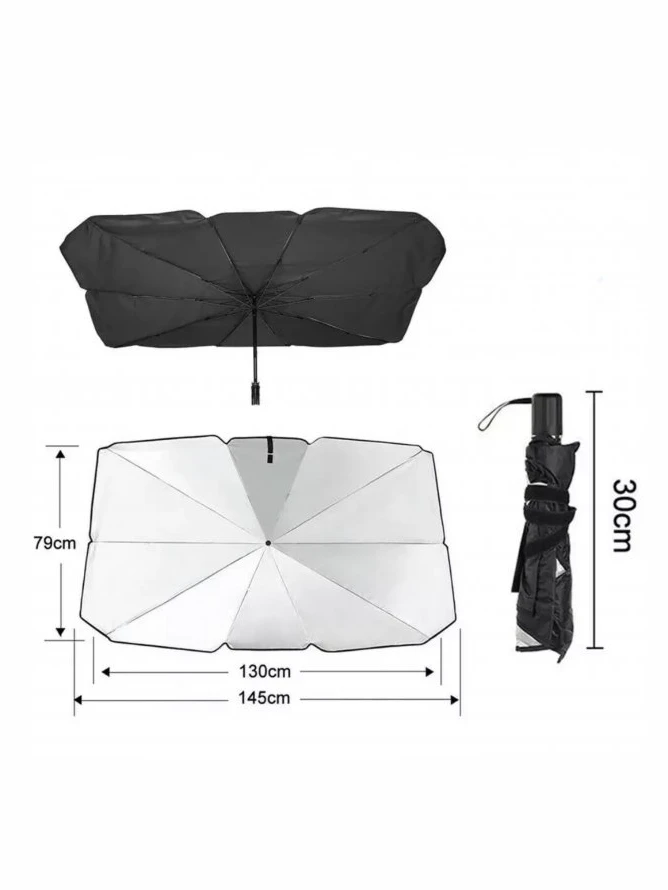 Компактный складной зонт-шторка — это эффективная защита салона автомобиля от жары и солнечных лучей. Благодаря складной конструкции в виде зонта, он быстро устанавливается и складывается за считанные секунды. Подходит для большинства легковых автомобилей и внедорожников.
