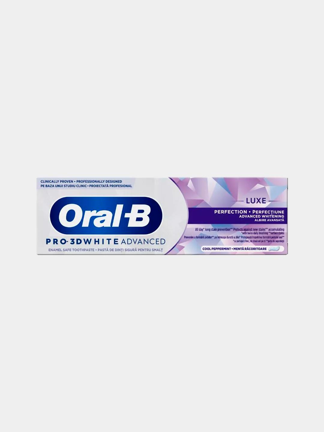 Откройте для себя сияющую улыбку с зубной пастой Oral-B 3D White Advanced Luxe Perfection! Эта паста разработана для усовершенствованного отбеливания зубов и обеспечивает клинически доказанную защиту от пятен до 24 часов при чистке зубов дважды в день. Она помогает удалить до 100% поверхностных пятен, даря вам ослепительную улыбку и ощущение свежести.