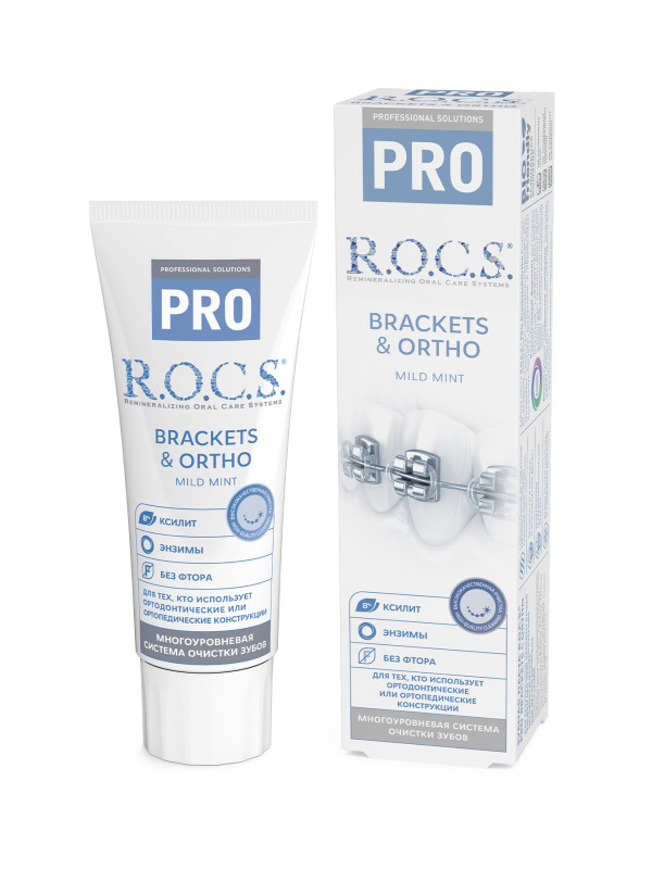 Специально разработанная зубная паста R.O.C.S. "Brackets & Ortho" предназначена для бережного и эффективного ухода за зубами и дёснами во время ношения брекет-систем и других ортодонтических конструкций. Благодаря усиленной формуле с активным кальцием и ксилитом паста укрепляет эмаль, предотвращает развитие кариеса и снижает воспаление дёсен. Обеспечивает качественную очистку труднодоступных участков и сохраняет свежесть дыхания.